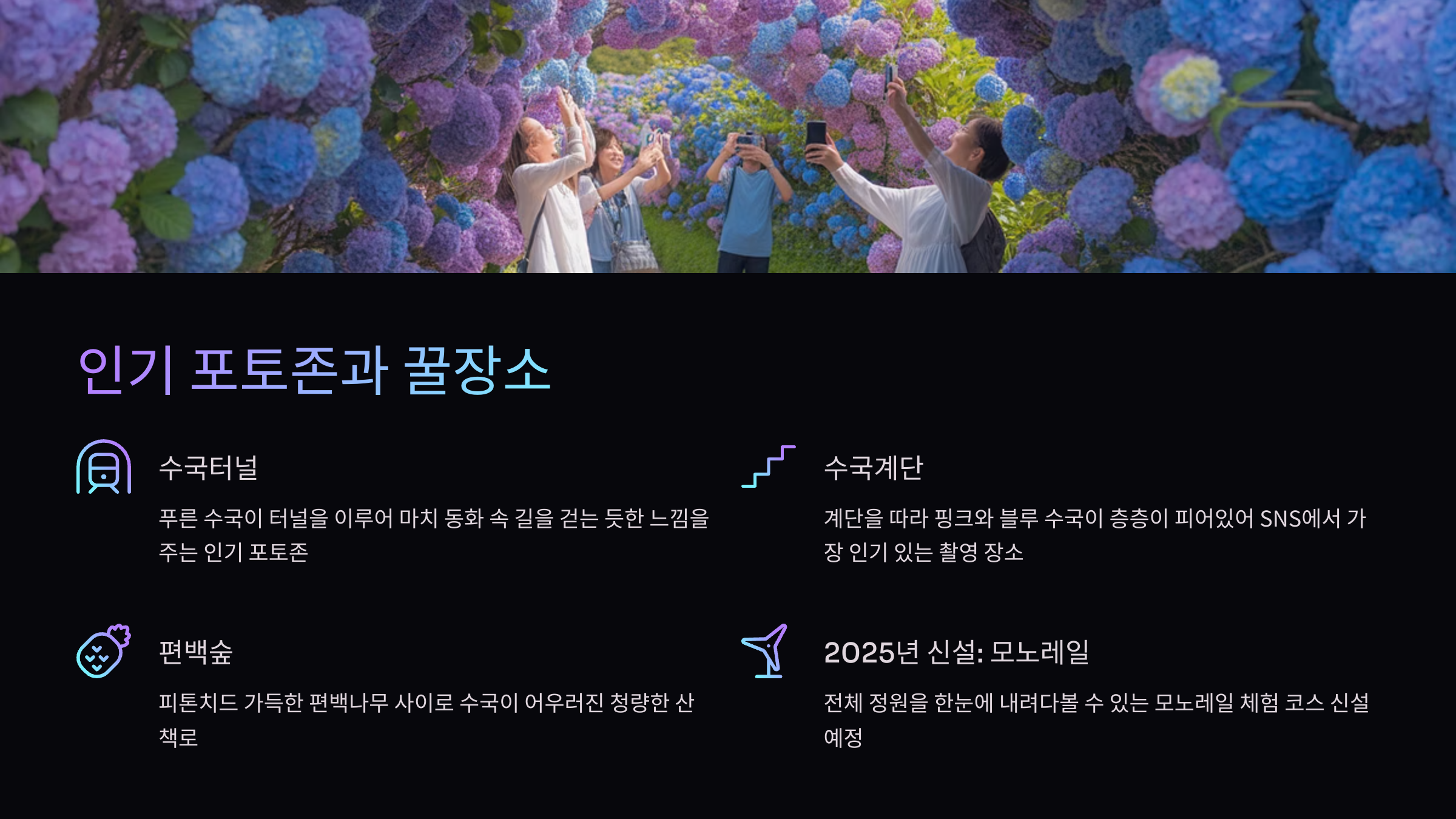 | 수국 아치 | 축제 입구 | 다채로운 색의 수국으로 구성 |