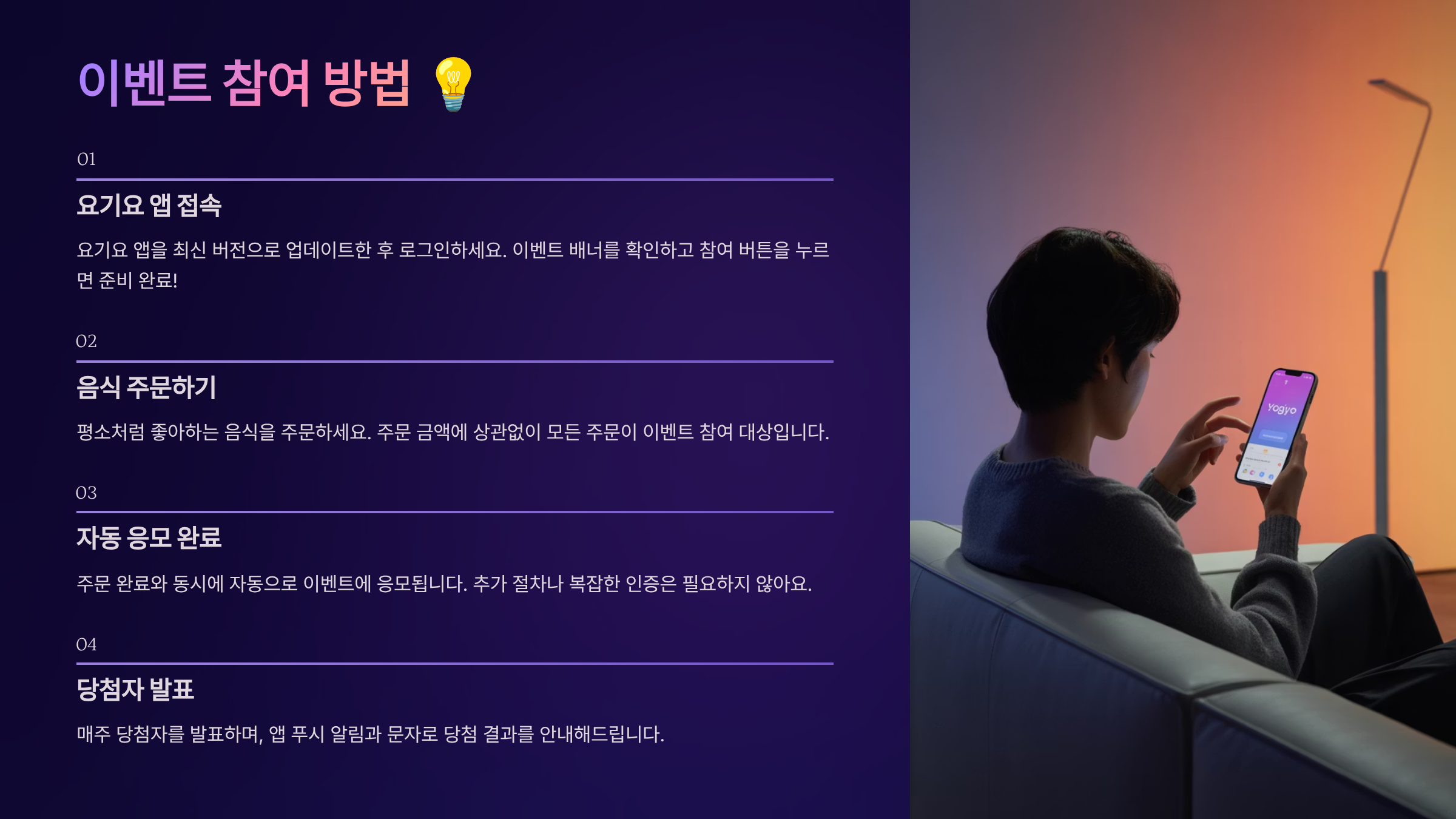 - 요기요의 다양한 이벤트 소식은 공식 앱 내 공지사항 및 SNS 채널에서 가장 빠르게 확인할 수 있습니다.