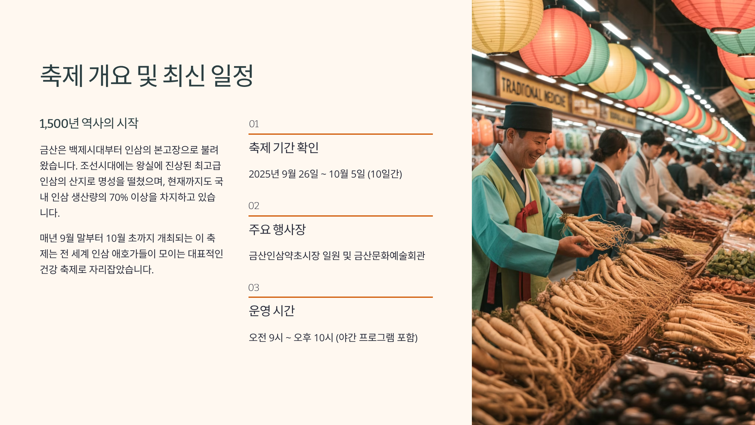 1,500년 고려인삼의 역사를 간직한 충청남도 금산에서 매년 열리는 금산세계인삼축제는 단순한 지역 축제를 넘어 대한민국을 대표하는 산업형 축제로 자리매김했습니다. 특히 2025년 제43회 축제는 인삼의 전통적인 가치에 더해, AI, 로봇, K-팝 등 첨단 기술과 현대 문화를 결합하여 더욱 풍성하고 역동적인 경험을 선사할 예정입니다. 지난해 115만 명이 방문해 1,366억 원의 경제 효과를 창출한 만큼, 올해도 많은 기대를 모으고 있습니다. 인삼의 효능을 직접 체험하고, 신선한 인삼을 저렴하게 구매하며, 다채로운 공연과 볼거리로 오감을 만족시킬 수 있는 금산세계인삼축제에 대한 모든 것을 이 글에서 상세히 안내해 드립니다.