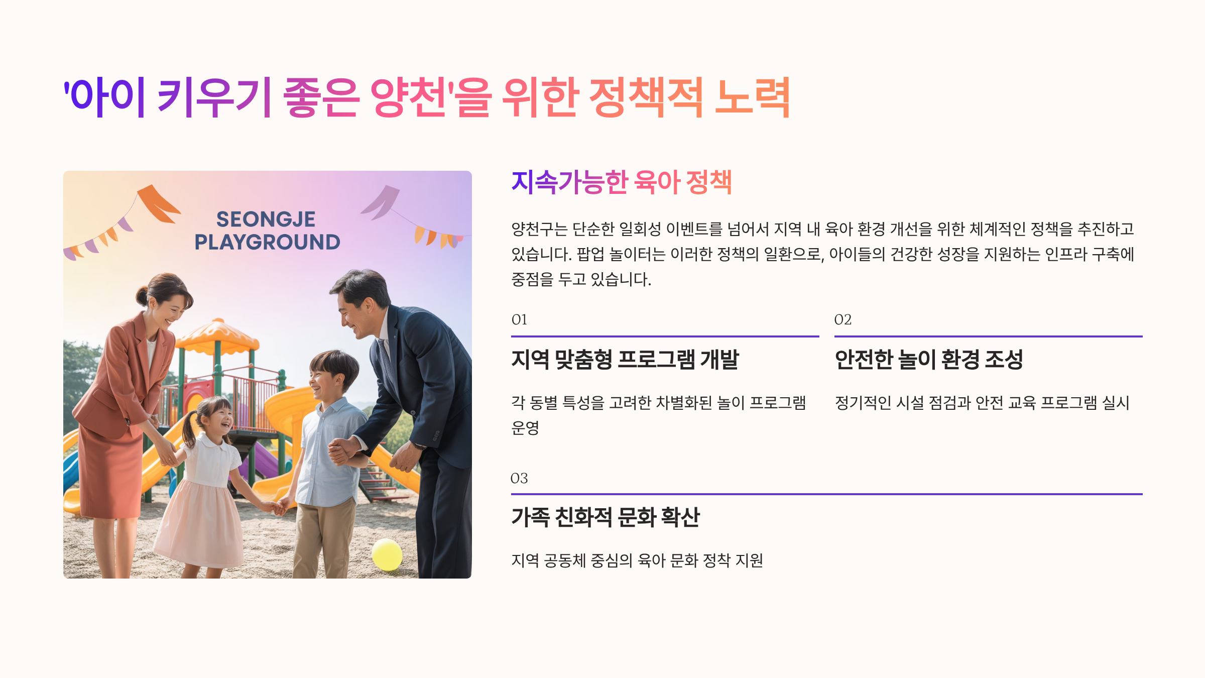 이번 '테마형 야외 팝업 놀이터' 운영은 양천구가 추진하는 다양한 아동 정책의 일환입니다. 양천구는 현재 공공형 실내 놀이터인 '서울형 키즈카페'를 7곳 운영하고 있으며, 연말까지 4곳을 추가로 조성해 총 11곳으로 확대할 계획입니다. 이는 저렴한 이용료로 양질의 놀이시설과 돌봄 서비스를 제공하여 부모들의 양육 부담을 실질적으로 줄여주려는 노력입니다. 또한, '양천형 공동 육아방' 등 다양한 보육 정책을 통해 아이들이 건강하게 성장하고 부모들이 안심하고 아이를 키울 수 있는 환경을 조성하고 있습니다. 이번 팝업 놀이터 역시 야외 놀이 공간을 확충하여 아이들의 창의력과 신체 발달을 돕는다는 점에서 양천구의 미래를 위한 중요한 투자라고 할 수 있습니다.