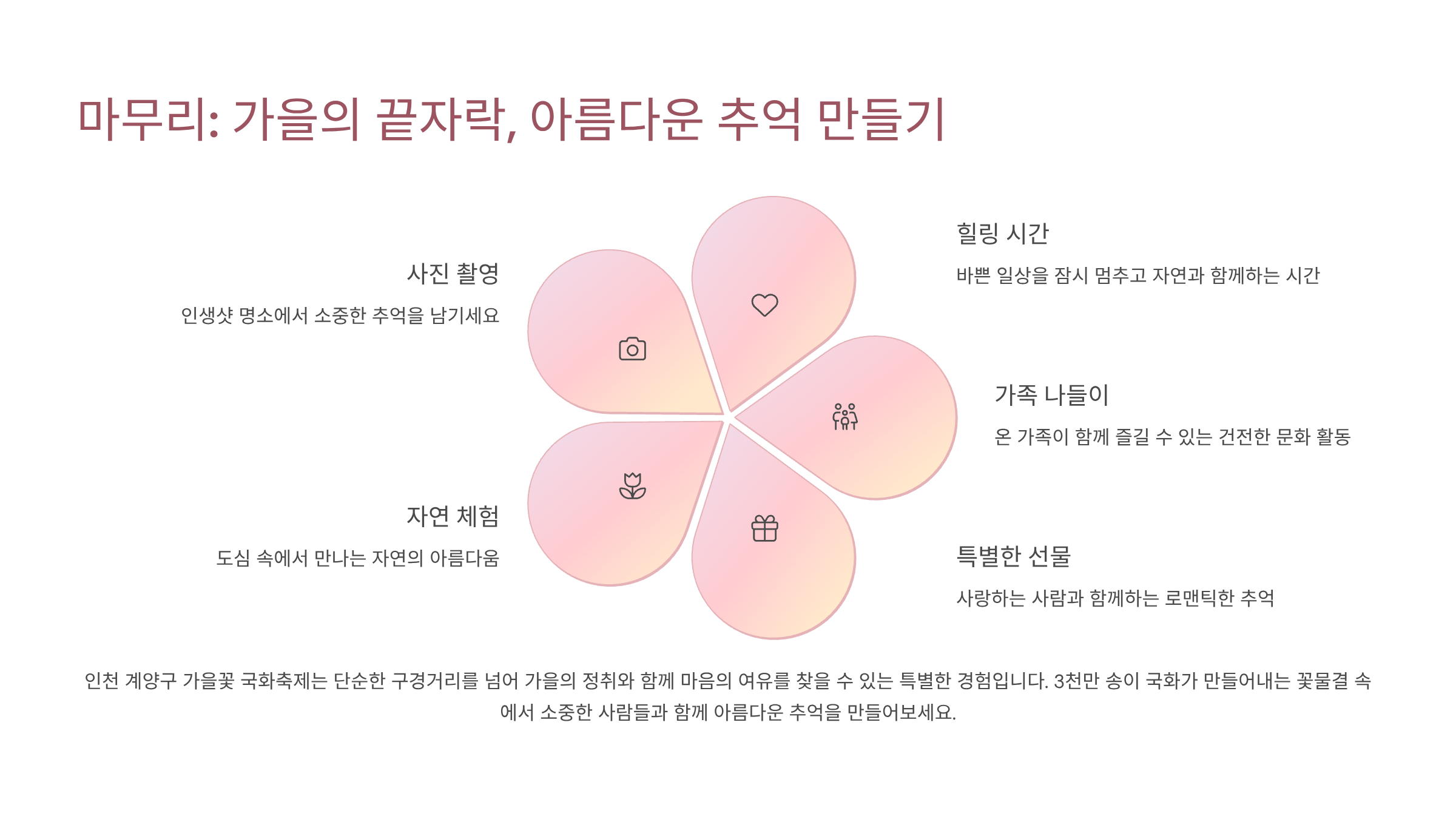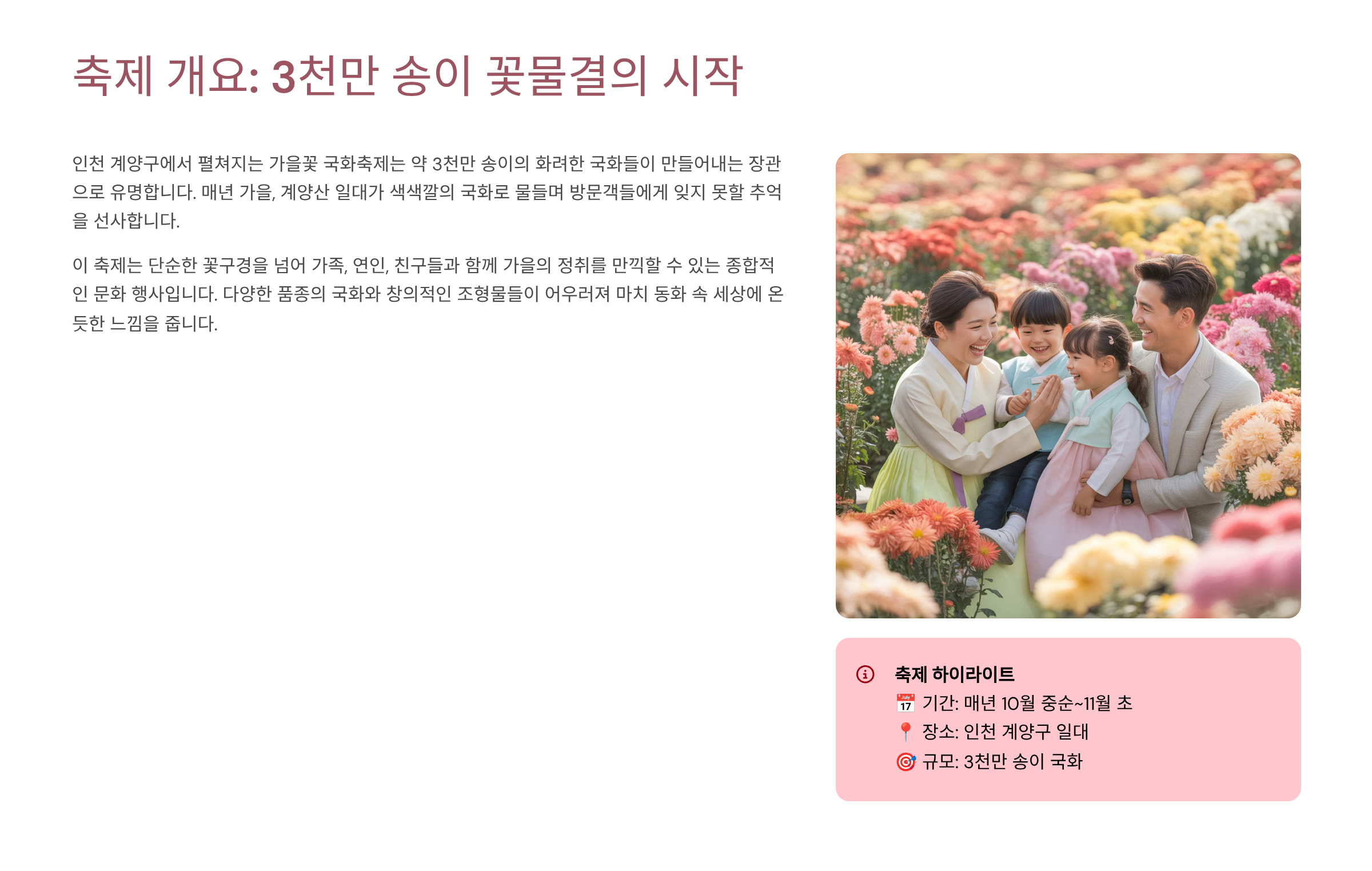 지금까지 인천 계양구 가을꽃 국화축제에 대한 모든 것을 자세히 살펴보았습니다. 이번 축제는 단순히 꽃을 구경하는 것을 넘어, 사랑하는 사람들과 함께 가을의 정취를 느끼고 특별한 추억을 만들 수 있는 소중한 시간이 될 것입니다. 3천만 송이의 꽃이 만들어내는 장관은 물론, 다양한 체험 프로그램과 야간 빛의 거리까지, 낮과 밤 모두 즐길 거리가 풍부하게 마련되어 있습니다. 축제 방문을 계획하고 계신다면 이 글이 여러분의 완벽한 가이드가 되기를 바랍니다. 특히, 축제의 핵심 주제인 '가족의 의미와 사랑의 소중함'을 생각하며 방문한다면 더욱 깊은 감동을 느낄 수 있을 것입니다.