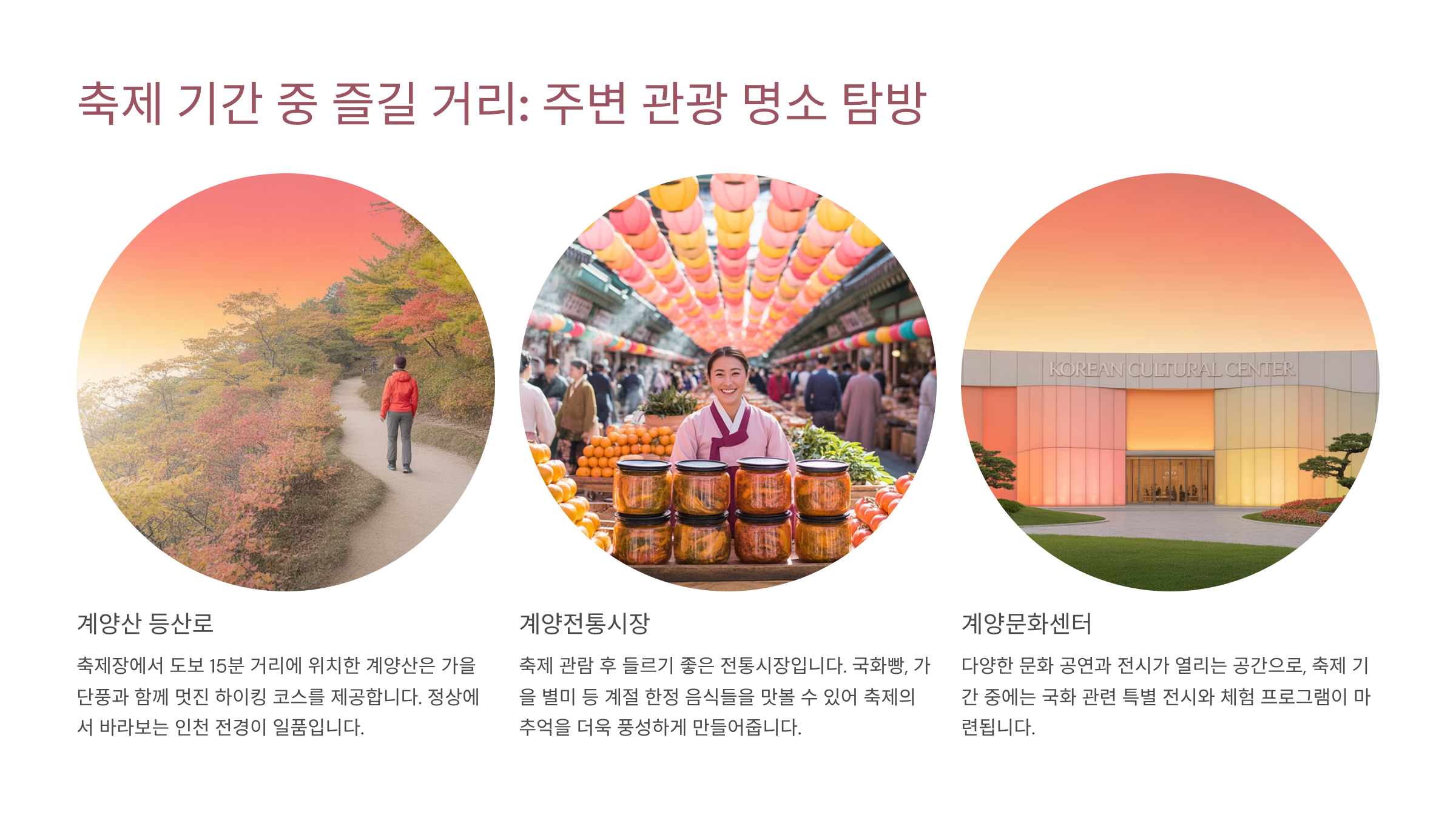 ✅ 계양산: 가을 단풍이 아름다운 계양산은 축제 관람 후 가벼운 등산을 즐기기 좋습니다. 정상에서 바라보는 풍경은 가을의 정취를 더욱 깊게 느끼게 해줍니다.