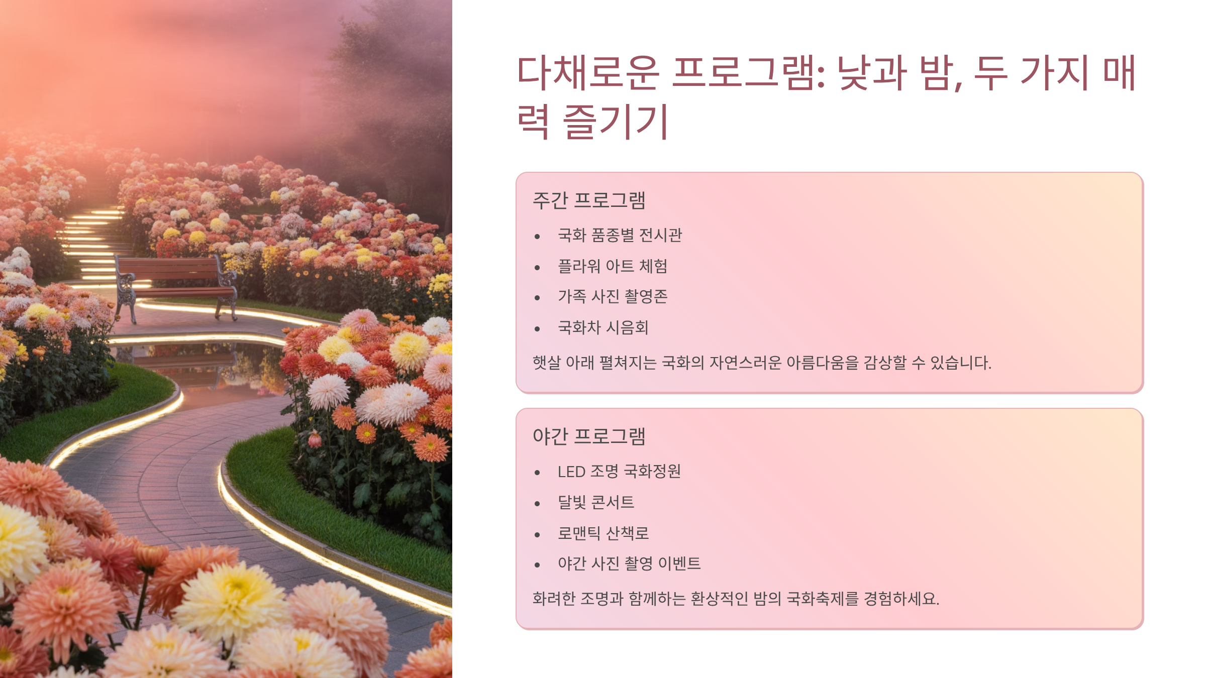 주요 행사: 낮 꽃밭 관람, 밤 빛의 거리 산책