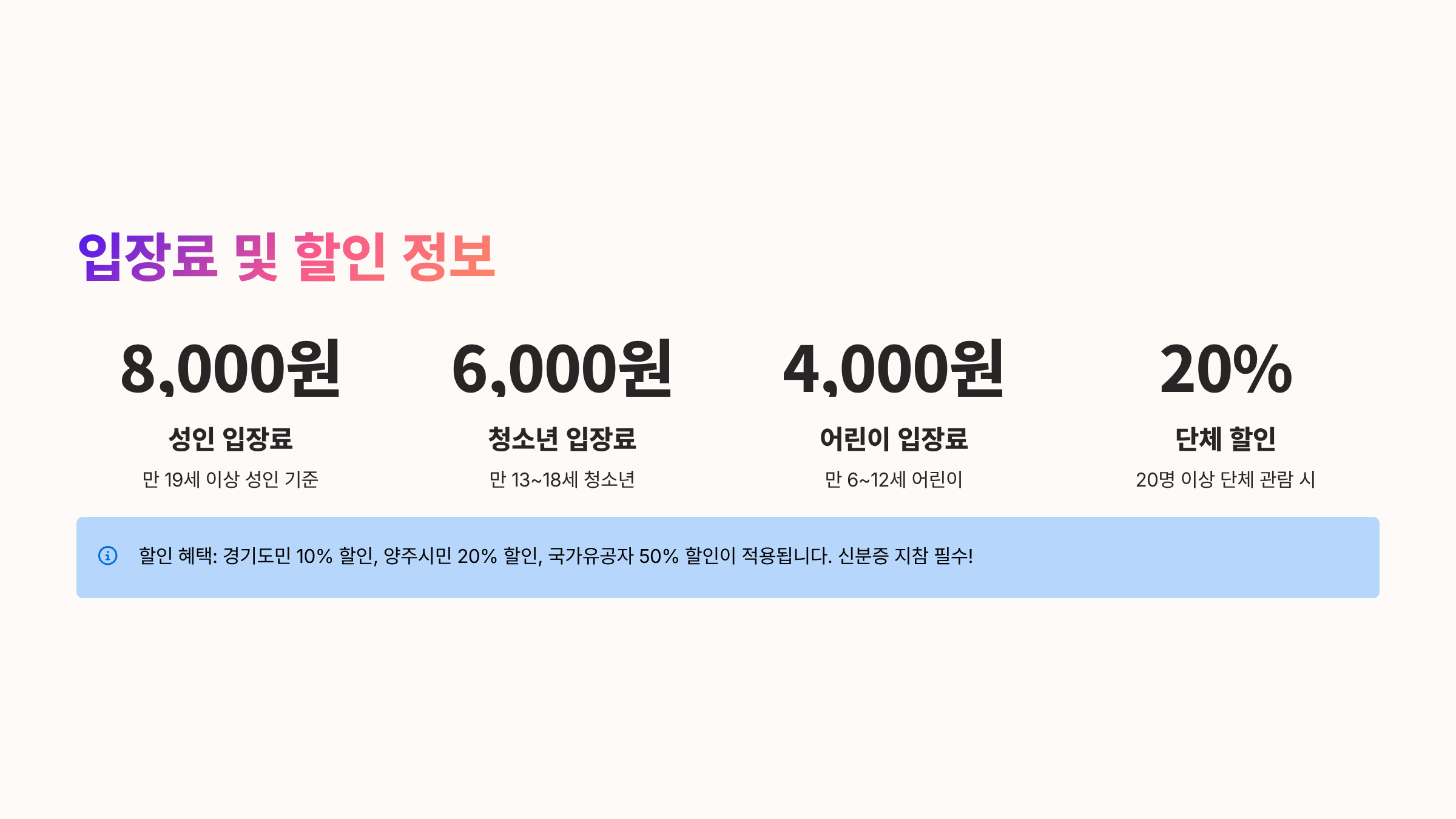 A: 양주시민의 경우 신분증을 제시하면 할인된 가격으로 입장할 수 있습니다.