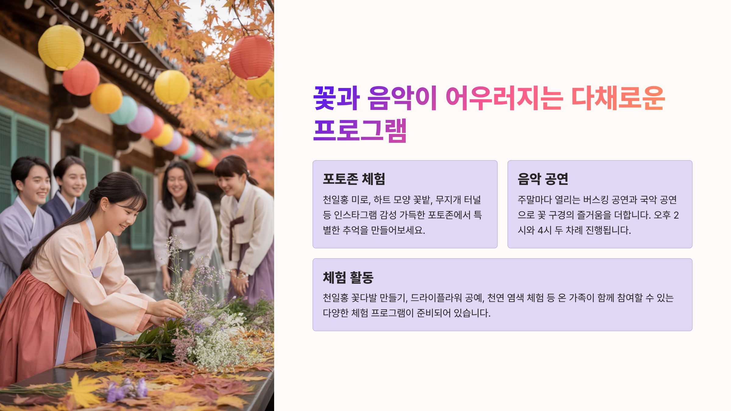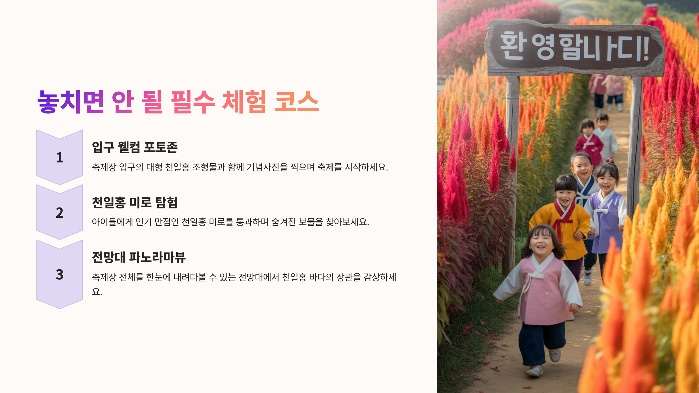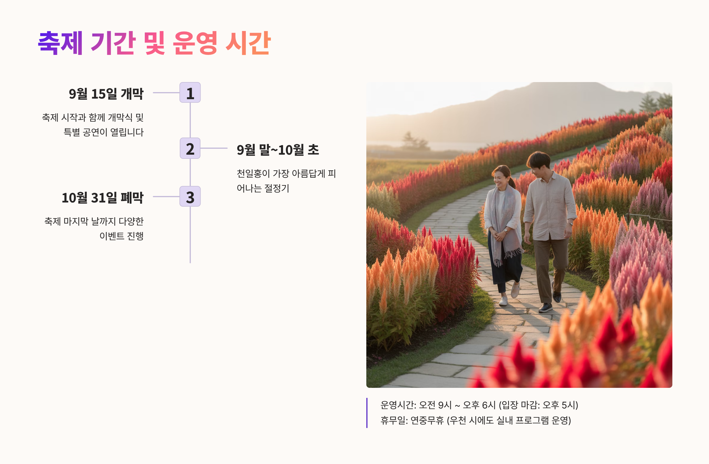 💡 알아두세요! 축제는 3일간 진행되는 본 행사와 꽃밭 개방 기간으로 나뉘어 운영되므로 방문 목적에 맞게 일정을 확인하는 것이 중요합니다.
