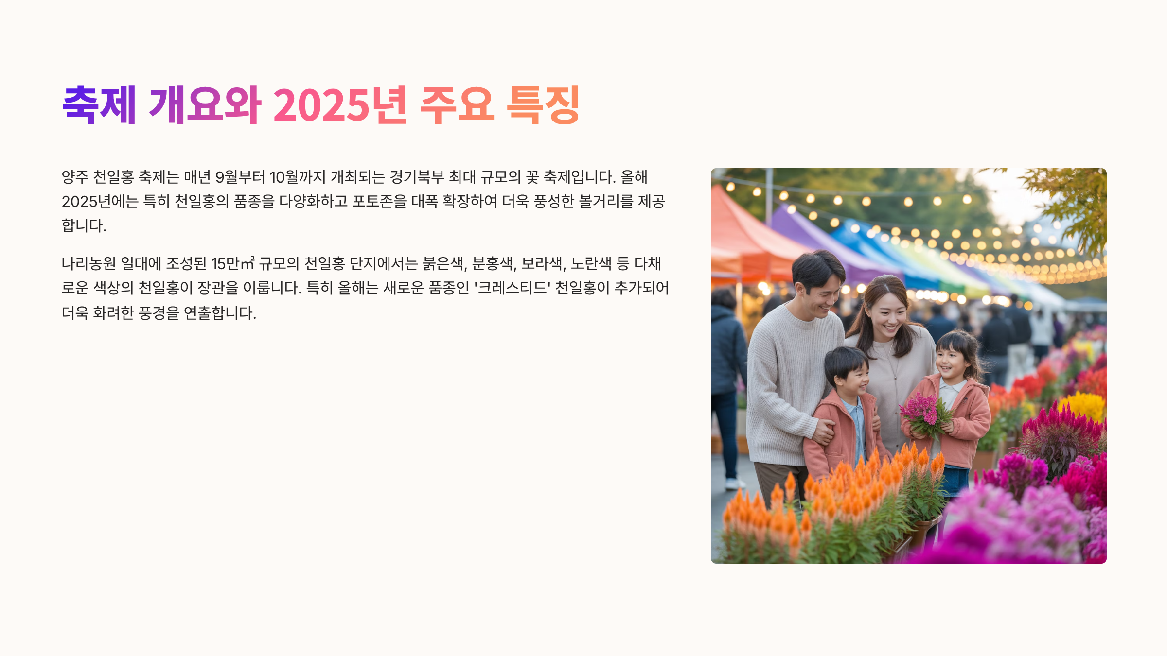 가을의 낭만을 가득 담은 양주 천만송이 천일홍 축제는 단순히 아름다운 풍경을 보는 것을 넘어, 다양한 문화와 예술을 함께 즐길 수 있는 특별한 경험을 제공합니다. 이 글의 정보를 참고하셔서 2025년 양주 천일홍 축제를 더욱 즐겁고 의미 있게 보내시길 바랍니다. 궁금한 점이 있다면 언제든지 댓글로 문의해 주세요! 😊