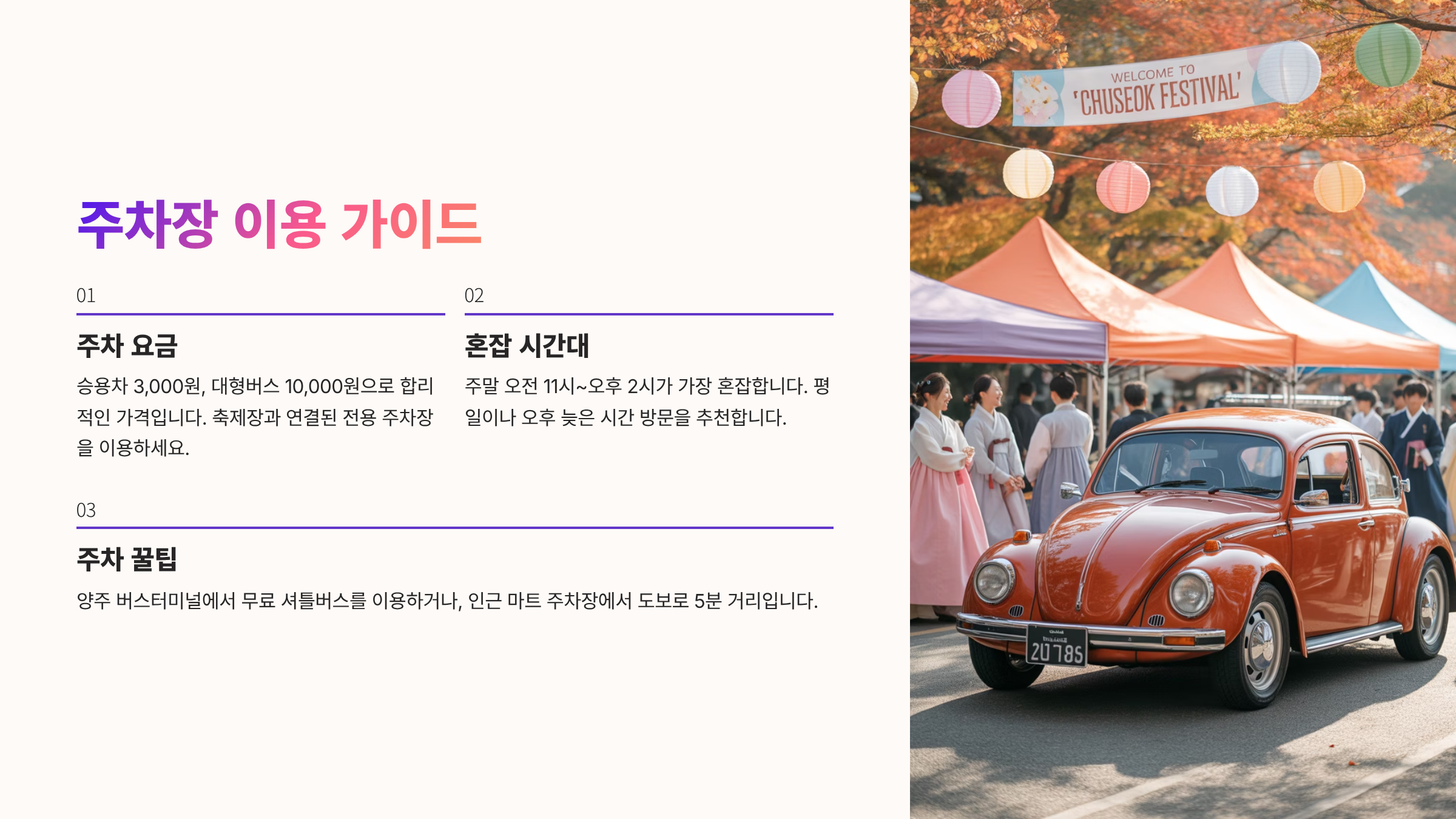 💡 알아두세요! 주차장에서 축제장까지는 도보로 이동해야 하므로, 편안한 신발을 착용하는 것이 좋습니다. 특히, 주차료는 무료로 운영될 예정입니다.
