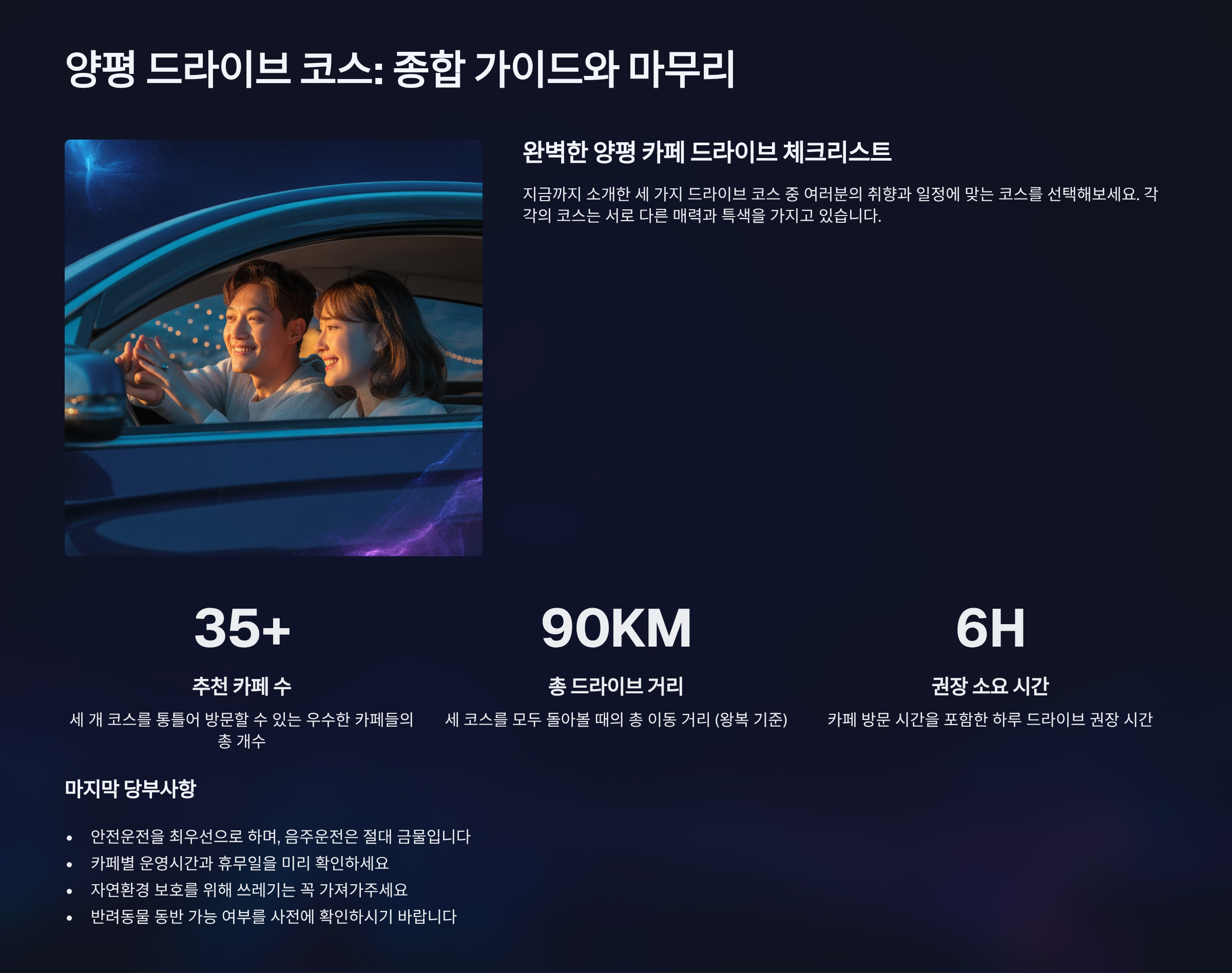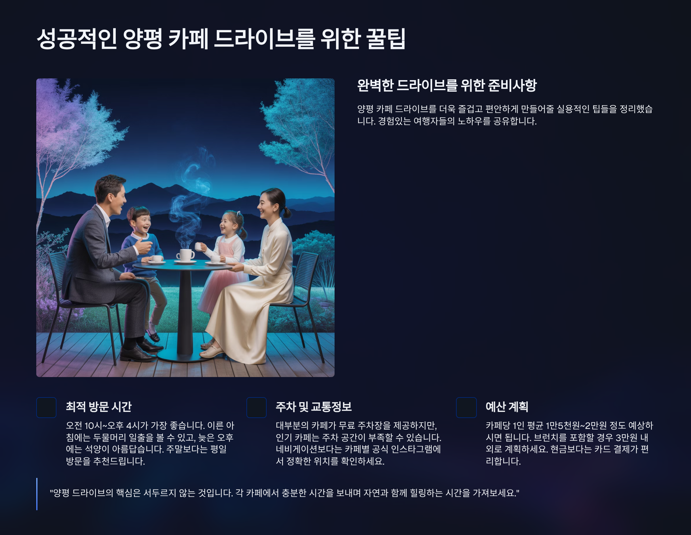 지금까지 양평 카페거리 드라이브 코스를 세 가지 테마로 나누어 소개해 드렸습니다. 이 글에서 제안한 코스들은 양평의 다양한 매력을 경험할 수 있도록 구성되었지만, 가장 중요한 것은 자신의 취향에 맞는 코스를 직접 만들어보는 것입니다. 드라이브를 통해 새로운 곳을 발견하고, 멋진 카페에서 소중한 사람들과 추억을 쌓는 과정 자체가 여행의 가장 큰 즐거움이니까요. 이 글이 여러분의 양평 드라이브 여행 계획에 작은 도움이 되기를 바랍니다.