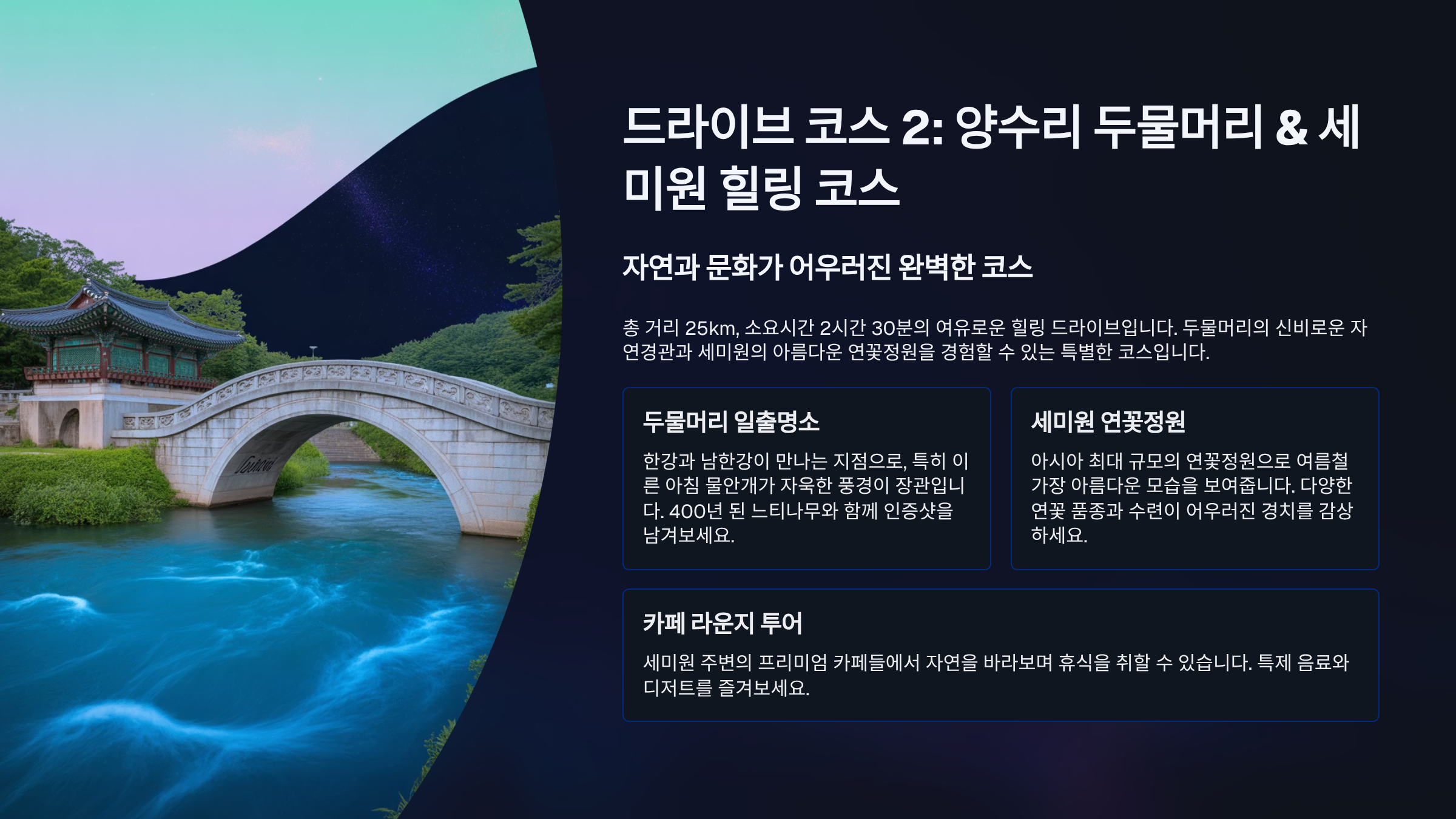 일상의 번잡함에서 벗어나고 싶을 때, 서울 근교 드라이브 명소로 손꼽히는 양평은 언제나 좋은 선택지입니다. 특히 아름다운 북한강변을 따라 펼쳐지는 낭만적인 카페거리는 많은 이들의 사랑을 받고 있죠. 단순히 커피 한 잔을 마시는 것을 넘어, 자연 속에서 진정한 휴식을 만끽할 수 있는 곳입니다. 이번 포스트에서는 양평의 숨겨진 보석 같은 카페들과 그곳을 잇는 환상적인 드라이브 코스를 상세하게 소개해 드릴게요. 각 코스별 특징과 꼭 들러야 할 명소들을 포함하여, 여러분의 주말 나들이를 더욱 특별하게 만들어 줄 완벽한 가이드를 제공합니다.