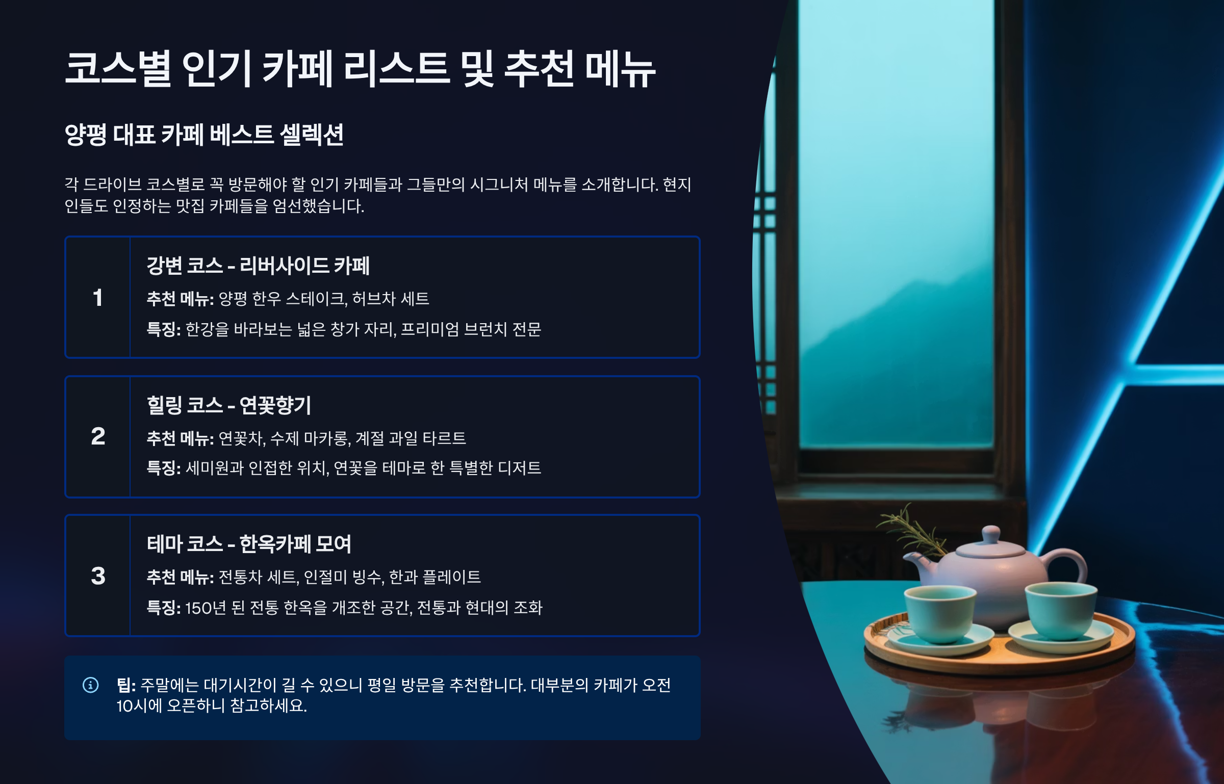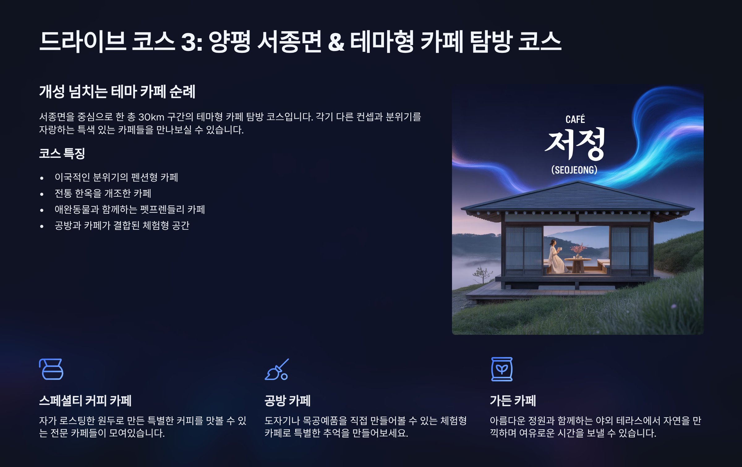 양평 카페거리, 최고의 드라이브 코스는? 서울 근교에서 가볍게 떠나고 싶은 당신을 위해, 양평 카페거리의 매력을 200% 즐길 수 있는 드라이브 코스와 핫플레이스를 상세히 안내합니다. 주말 데이트, 가족 나들이 계획에 완벽한 정보를 담았습니다.