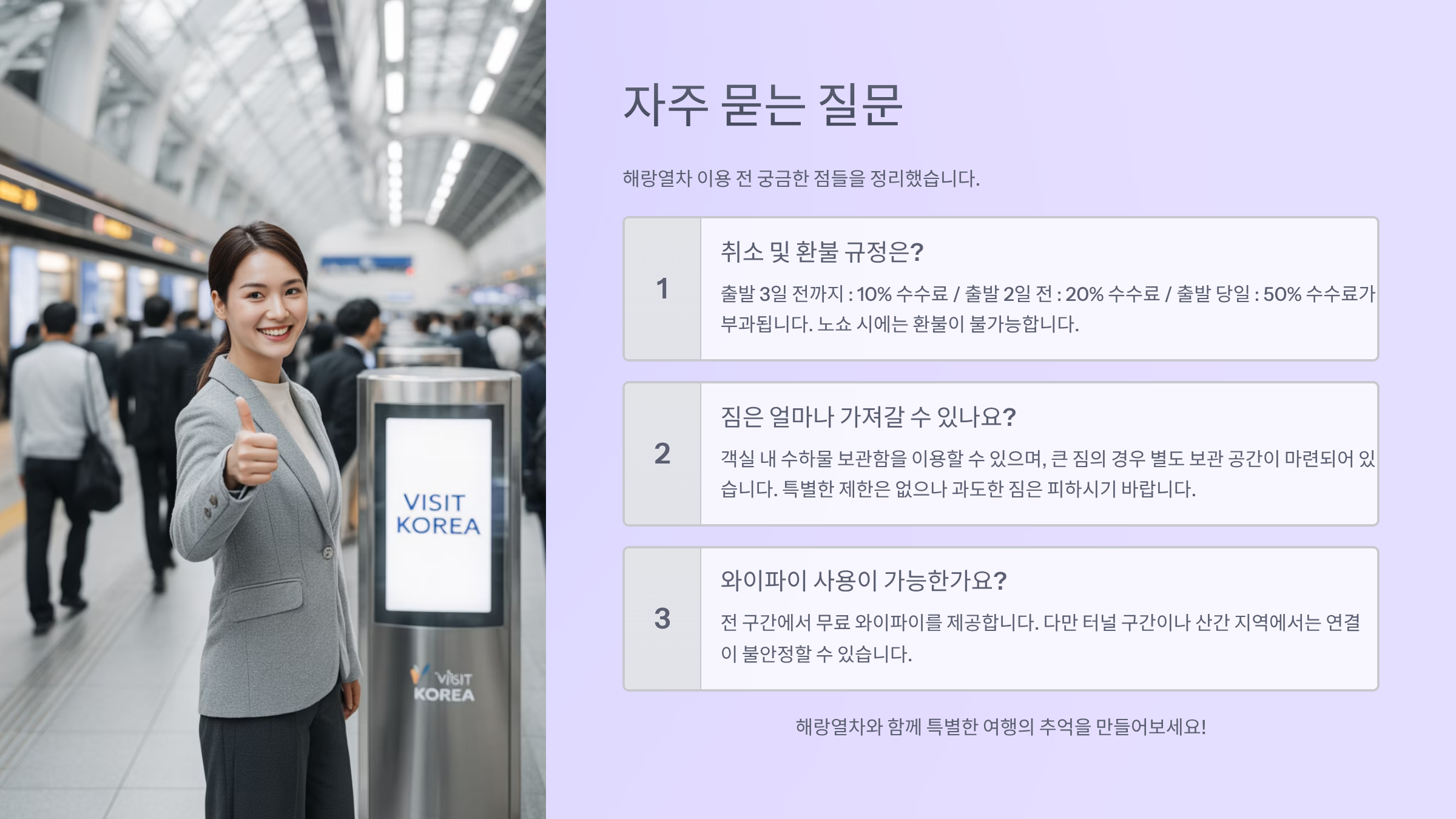 해랑열차는 단순히 이동하는 수단이 아니라, 여행의 모든 순간을 특별하게 만들어주는 '움직이는 호텔'입니다. 높은 가격 때문에 망설일 수 있지만, 그 비용이 제공하는 가치는 충분히 그 이상이라고 생각합니다. 사랑하는 사람과 잊지 못할 추억을 만들고 싶거나, 부모님께 최고의 효도를 선물하고 싶다면, 해랑열차를 한번 고려해 보시는 건 어떨까요? 이 글이 여러분의 특별한 여행 계획에 도움이 되었기를 바랍니다. 더 궁금한 점이 있다면 언제든지 댓글로 물어봐주세요! 😊