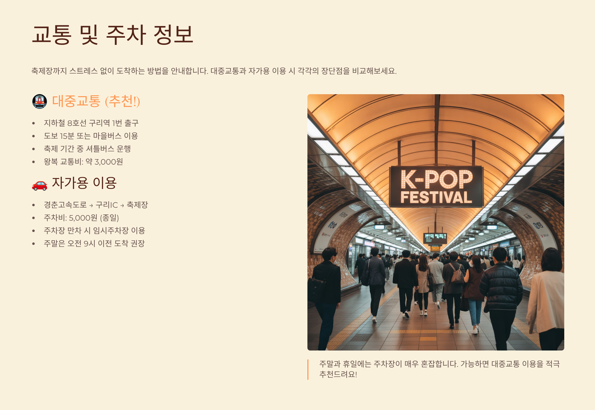 4. 교통 및 주차 정보: 대중교통 VS 자가용, 최적의 방법은? 🚗