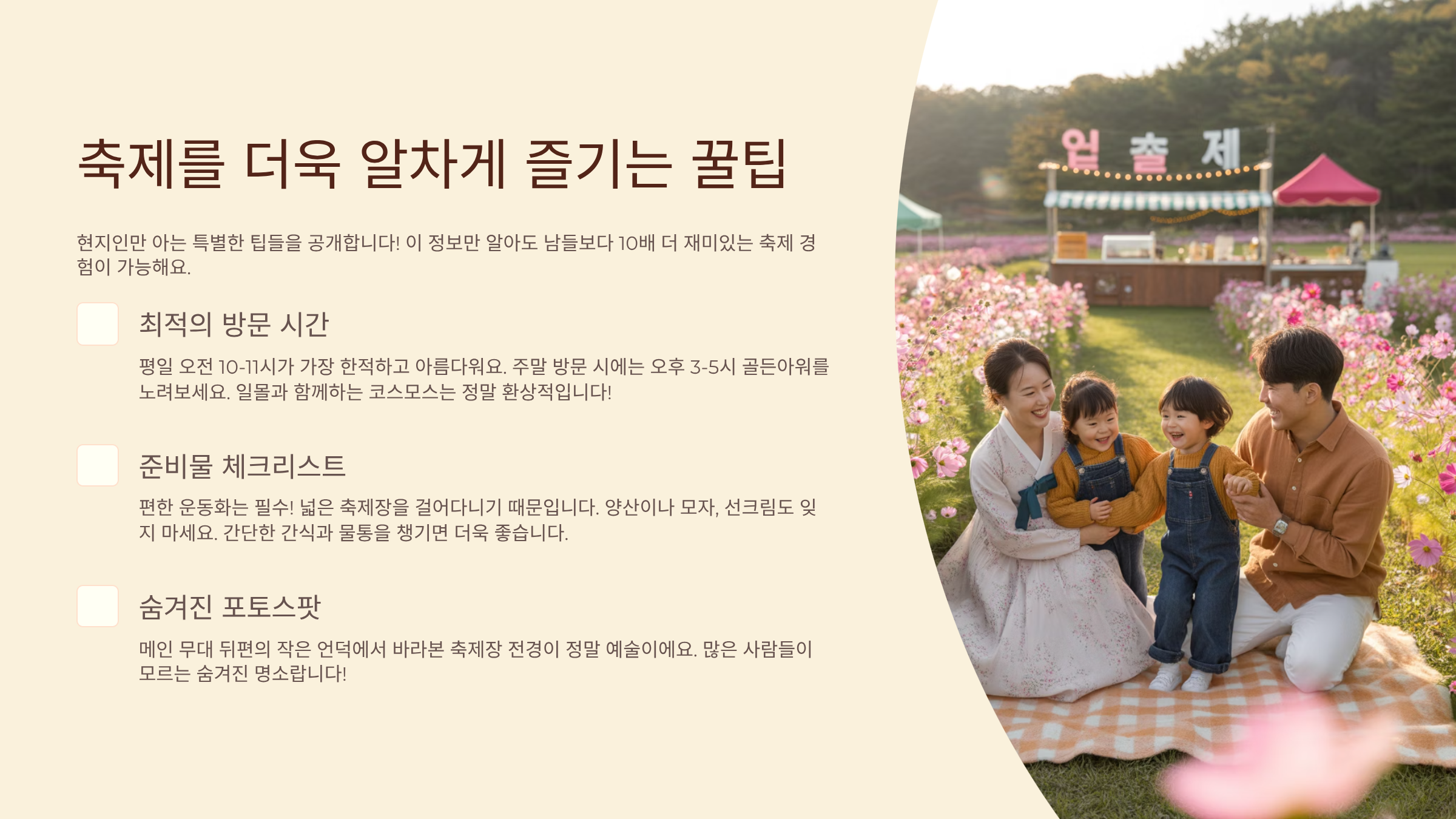 6. 구리 코스모스 축제, 더욱 알차게 즐기는 팁 ✅