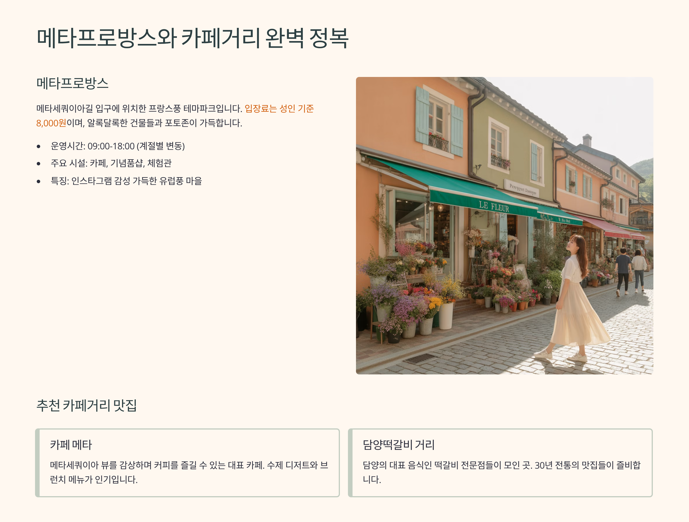 담양 메타세쿼이아길 맞은편에는 작은 유럽풍 마을인 '메타프로방스'가 조성되어 있습니다. 이곳에는 아기자기한 상점들과 함께 다양한 카페들이 모여 있어, 메타세쿼이아길 산책 후 잠시 쉬어가기 좋은데요. 메타프로방스 카페거리의 가장 큰 장점은 이국적인 분위기 속에서 커피 한 잔의 여유를 즐길 수 있다는 점입니다. 특히 '메타스토리', '소예르'와 같은 유명 카페들은 독특한 인테리어와 분위기로 인기를 끌고 있습니다. 이 외에도 아기자기한 소품샵, 갤러리 등이 있어 눈과 입이 모두 즐거운 시간을 보낼 수 있습니다. 메타프로방스 내에서는 별도의 입장료가 없으므로, 자유롭게 거리를 거닐며 마음에 드는 카페를 찾아보는 것도 좋은 방법입니다. 많은 카페들이 담양의 특산품인 대나무와 관련된 메뉴를 선보이니, 이색적인 경험을 원한다면 시도해 보는 것도 좋겠죠.