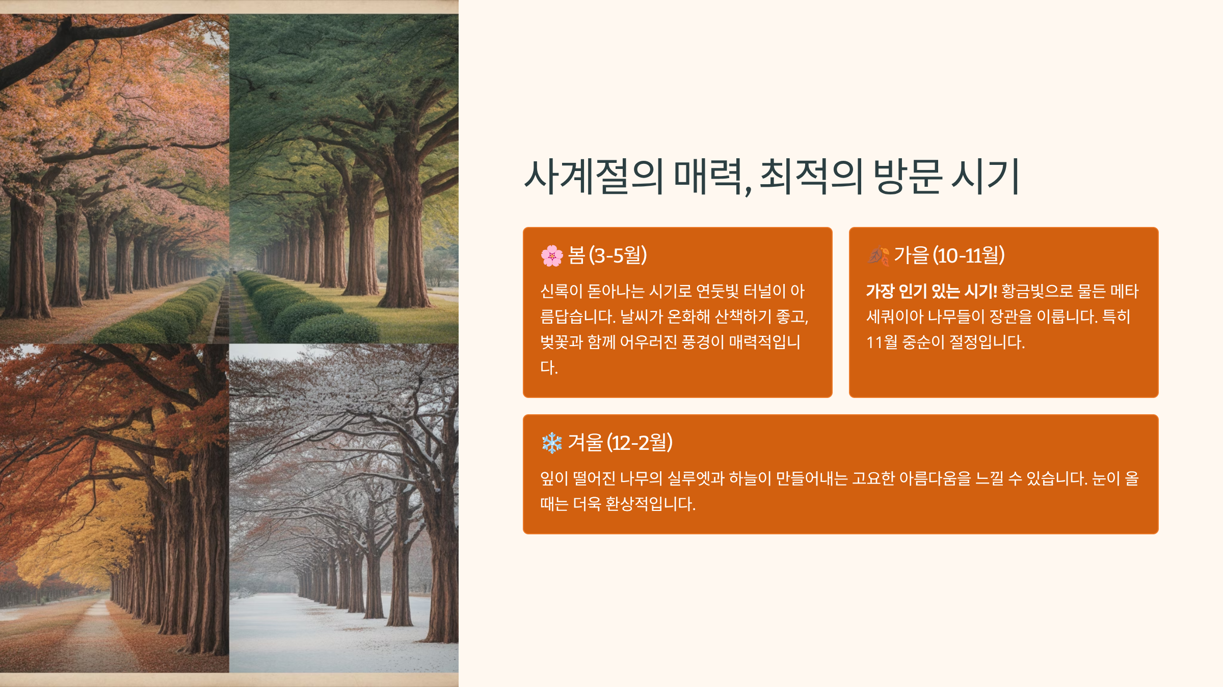 담양 메타세쿼이아길은 계절마다 다른 매력을 뽐내는 곳입니다. 특히 많은 사람이 '인생샷'을 남기기 위해 방문하는 시기는 바로 가을인데요. 9월 말에서 10월 초부터 시작되는 단풍이 절정에 이르면, 길게 늘어선 메타세쿼이아 나무들이 붉고 노란빛으로 물들어 환상적인 풍경을 연출합니다. 이 시기에는 방문객이 많아 조금 붐빌 수 있지만, 그만큼 최고의 사진을 건질 수 있는 기회이기도 합니다. 여름에는 푸르른 초록 터널이 시원함을 선사하며, 겨울에는 앙상한 가지들이 뿜어내는 쓸쓸하고 고요한 매력이 있습니다. 봄에는 싹을 틔우는 새싹들이 생동감을 더해주죠. 따라서 어떤 계절에 방문하더라도 나름의 아름다움을 발견할 수 있지만, 풍성한 사진을 원한다면 늦가을을, 푸른 자연 속에서 힐링을 원한다면 여름을 추천합니다. 방문 목적에 따라 최적의 시기를 선택해 보세요.