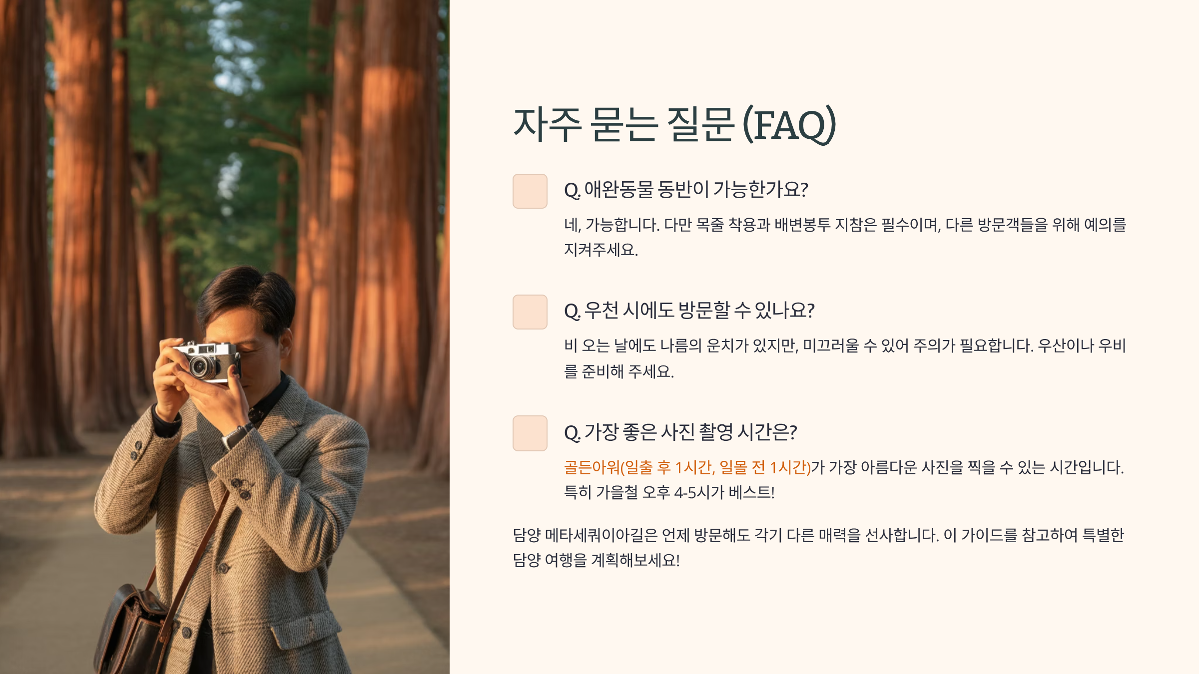 이 글이 여러분의 담양 메타세쿼이아길 여행에 조금이나마 도움이 되었기를 바랍니다. 계절에 따라, 함께 가는 사람에 따라 달라지는 담양의 매력을 충분히 느껴보세요. 더 궁금한 점이 있다면 댓글로 자유롭게 질문해 주세요. 😊