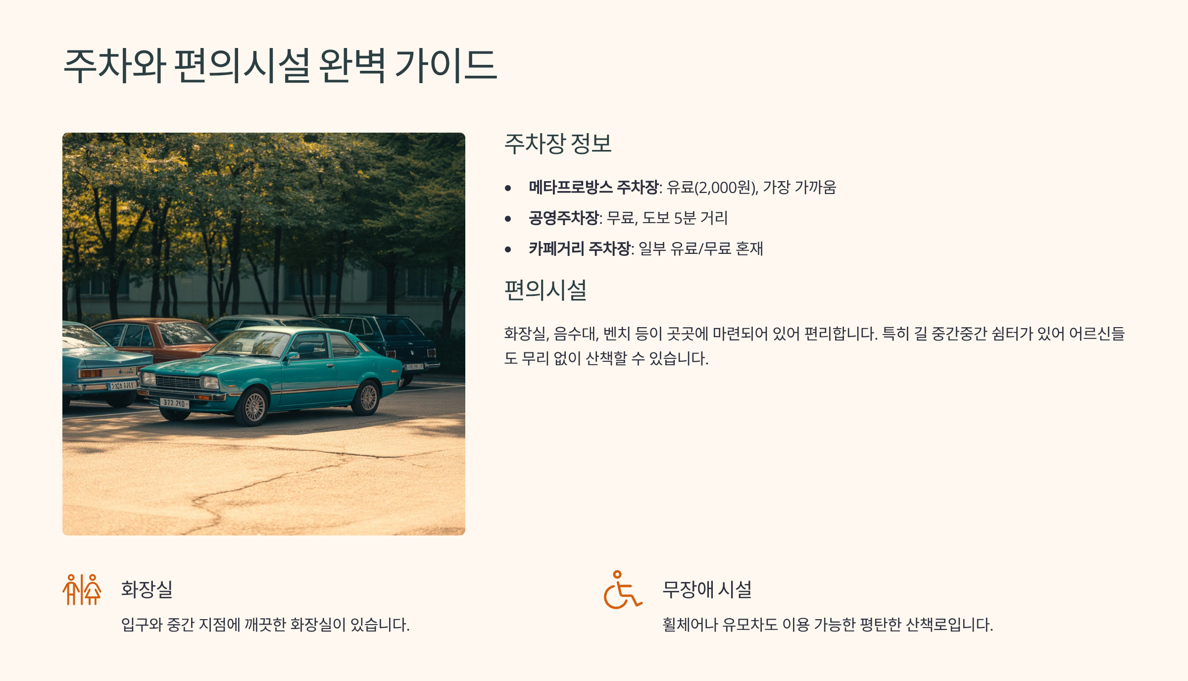 담양 메타세쿼이아길과 메타프로방스 주변에는 넓은 주차장이 여러 곳 마련되어 있어 차량을 이용한 방문객도 비교적 편리하게 이용할 수 있습니다. 메타프로방스 주차장을 이용하는 것이 일반적이며, 이곳은 무료로 운영됩니다. 주말이나 성수기에는 주차장이 혼잡할 수 있으니, 이른 시간에 방문하거나 주변 공영 주차장 정보를 미리 확인하는 것이 좋습니다. 산책로 곳곳에는 벤치가 설치되어 있어 쉬어가기 좋고, 간단한 음료와 간식을 판매하는 매점도 있습니다. 화장실과 같은 편의시설도 잘 갖추어져 있어 장시간 머물기에도 불편함이 없습니다. 또한, 메타세쿼이아길의 일부 구간은 맨발 흙길로 조성되어 있어, 맨발로 걷기 체험을 원하는 방문객들에게 좋은 경험을 제공합니다.