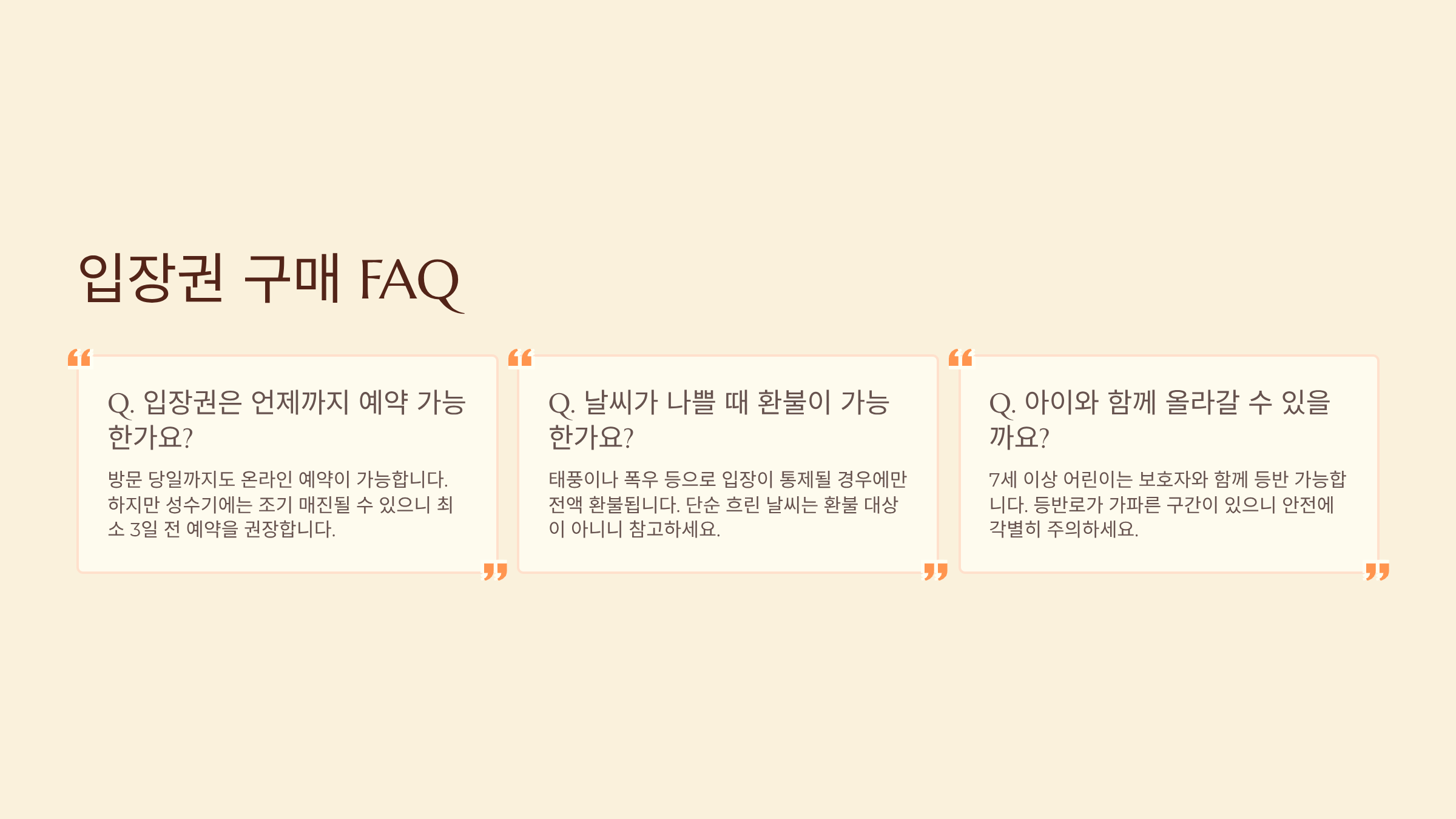 A: 입장 마감 시간은 계절에 따라 다르니, 방문 전 공식 홈페이지를 확인하는 것이 좋습니다.