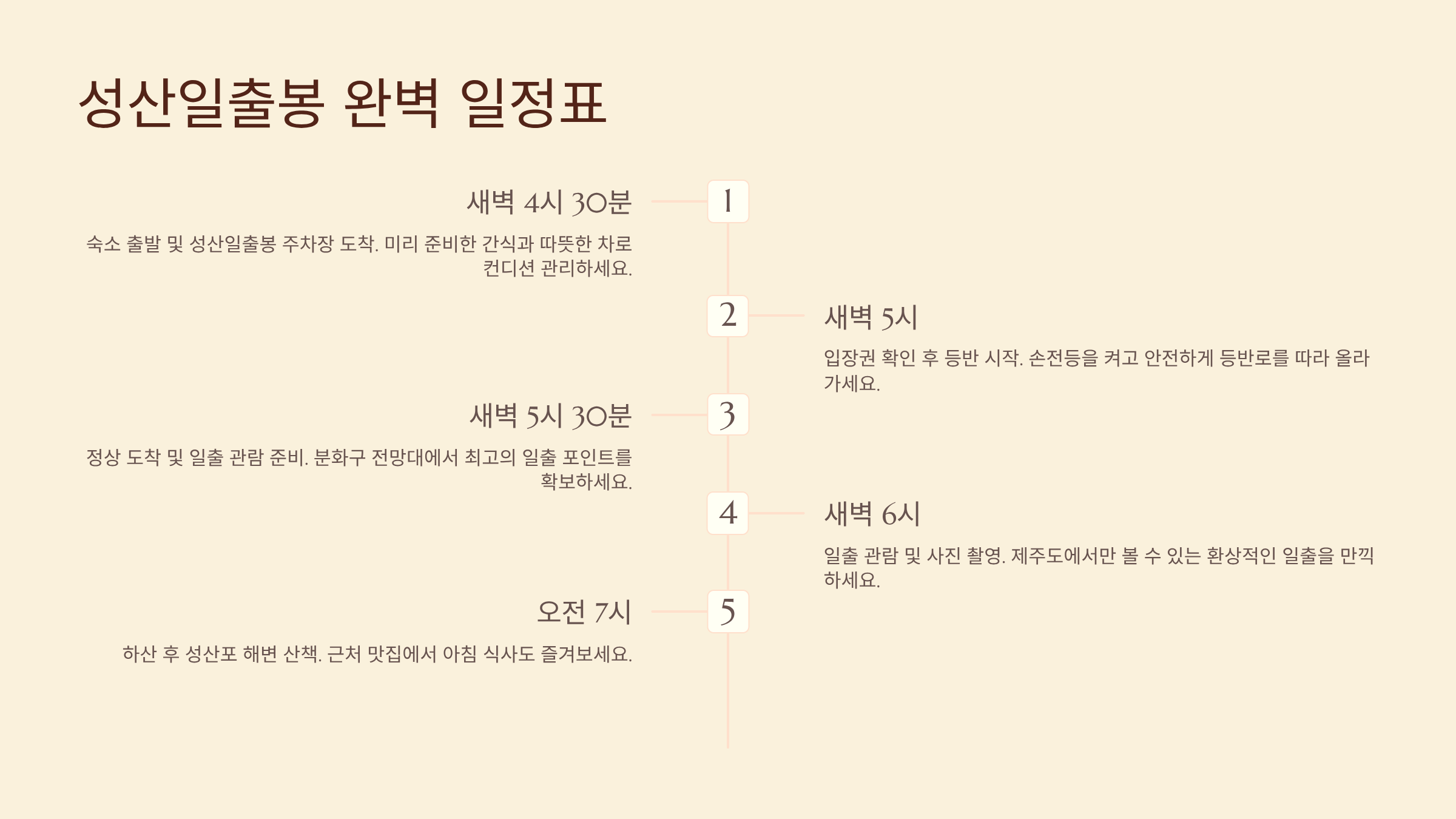 성산일출봉 여행을 계획할 때는 주변 숙소와 교통편도 함께 고려하는 것이 좋습니다. 특히 일출을 보고 싶다면, 새벽 이동을 위해 성산읍 주변에 숙소를 잡는 것이 가장 편리합니다. 성산일출봉 근처에는 다양한 가격대의 호텔, 펜션, 게스트하우스가 있으니 예산에 맞춰 선택할 수 있습니다. 교통편은 자가용이 가장 편리하지만, 뚜벅이 여행객이라면 대중교통을 이용할 수도 있습니다. 제주공항에서 성산일출봉까지는 직행 버스나 급행 버스가 운행되며, 소요 시간은 약 1시간 30분에서 2시간 정도입니다. 렌터카를 이용할 경우, 성산일출봉 주차장에 주차할 수 있습니다. 주차 공간이 넉넉하지만 성수기에는 일찍 만차될 수 있으니 주의해야 합니다. 또한, 성산일출봉을 중심으로 우도, 섭지코지, 광치기해변 등 주변 관광지와 함께 동선을 짜면 더욱 알찬 여행을 즐길 수 있습니다.