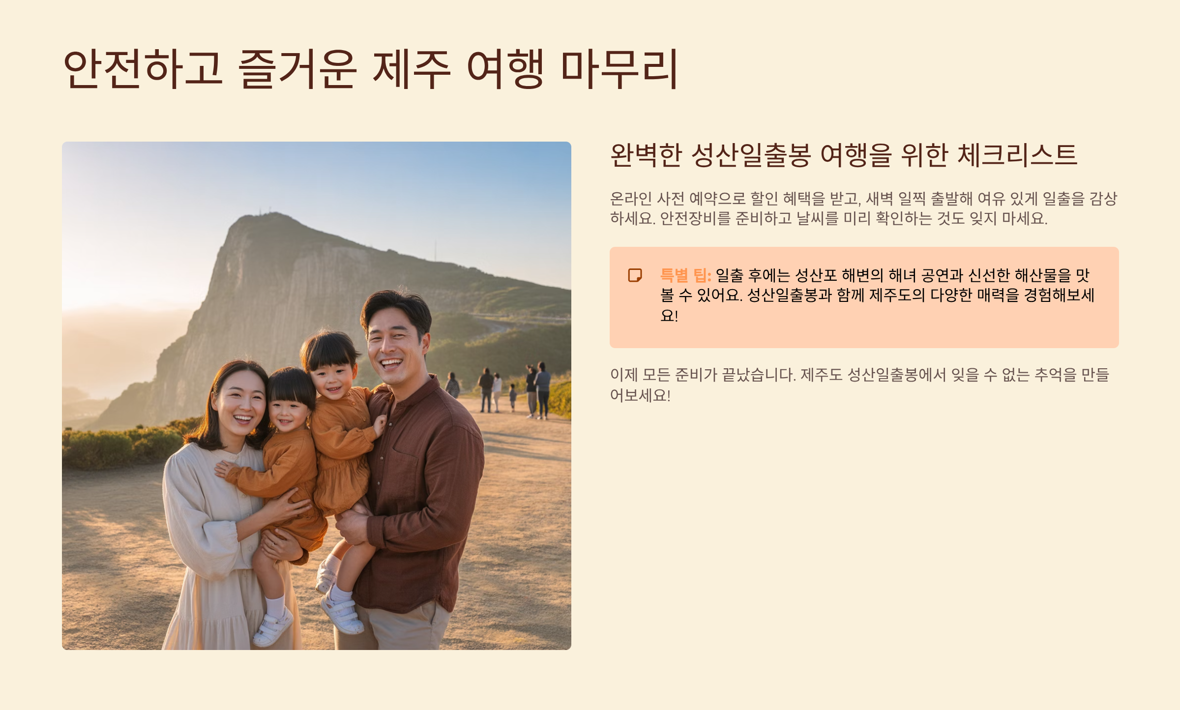 제주 성산일출봉은 단순한 관광지를 넘어, 자연의 위대함을 온몸으로 느낄 수 있는 특별한 장소입니다. 이 글에서 제시된 입장권 할인 예약 방법을 통해 비용 부담을 줄이고, 방문 꿀팁을 활용하여 더욱 알찬 여행을 즐기시길 바랍니다. 무엇보다 중요한 것은 안전입니다. 등반 시에는 지정된 탐방로를 이용하고, 날씨 변화에 대비하여 항상 주의를 기울여야 합니다. 제주 여행은 언제나 새로운 설렘을 선사합니다. 성산일출봉에서의 소중한 추억이 여러분의 삶에 활력소가 되기를 바라며, 더 궁금한 점이 있다면 언제든지 댓글로 남겨주세요. 모든 분들의 안전하고 즐거운 여행을 응원합니다. 💖