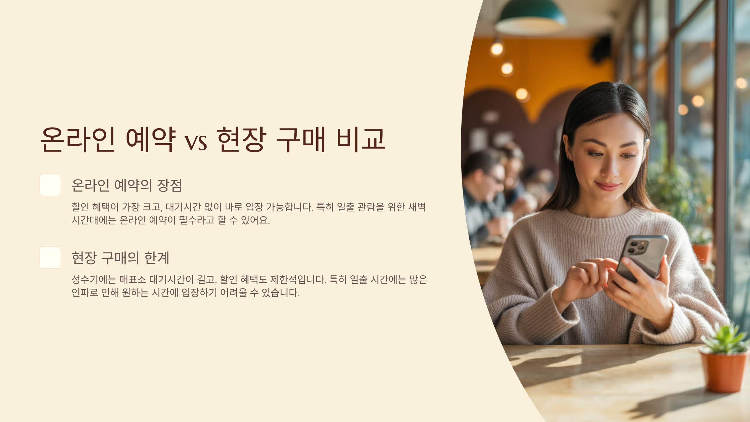 성산일출봉 입장권을 구매하는 방법은 크게 온라인 사전 예약과 현장 구매로 나뉩니다. 두 방법 모두 장단점이 명확하기 때문에 자신의 여행 스타일에 맞춰 선택하는 것이 중요합니다. 온라인 사전 예약은 대부분의 경우 할인된 가격으로 구매할 수 있으며, 결제 후 전송되는 바코드를 현장에서 바로 제시하면 되므로 매우 편리합니다. 특히, 주말이나 성수기에는 매표소 혼잡을 피할 수 있어 시간을 효율적으로 사용할 수 있습니다. 반면, 현장 구매는 별도의 준비 과정 없이 즉흥적으로 방문할 수 있다는 장점이 있습니다. 다만, 온라인 할인 혜택을 받을 수 없고, 대기줄이 길어질 수 있다는 점은 감수해야 합니다. 따라서 미리 여행 계획을 세워두고 시간을 아끼고자 한다면 온라인 예약을, 유연하고 자유로운 여행을 선호한다면 현장 구매를 고려해 볼 수 있습니다. 최근에는 대부분의 여행객이 온라인 예약을 선호하는 추세이니, 특별한 경우가 아니라면 사전 예약을 추천합니다.