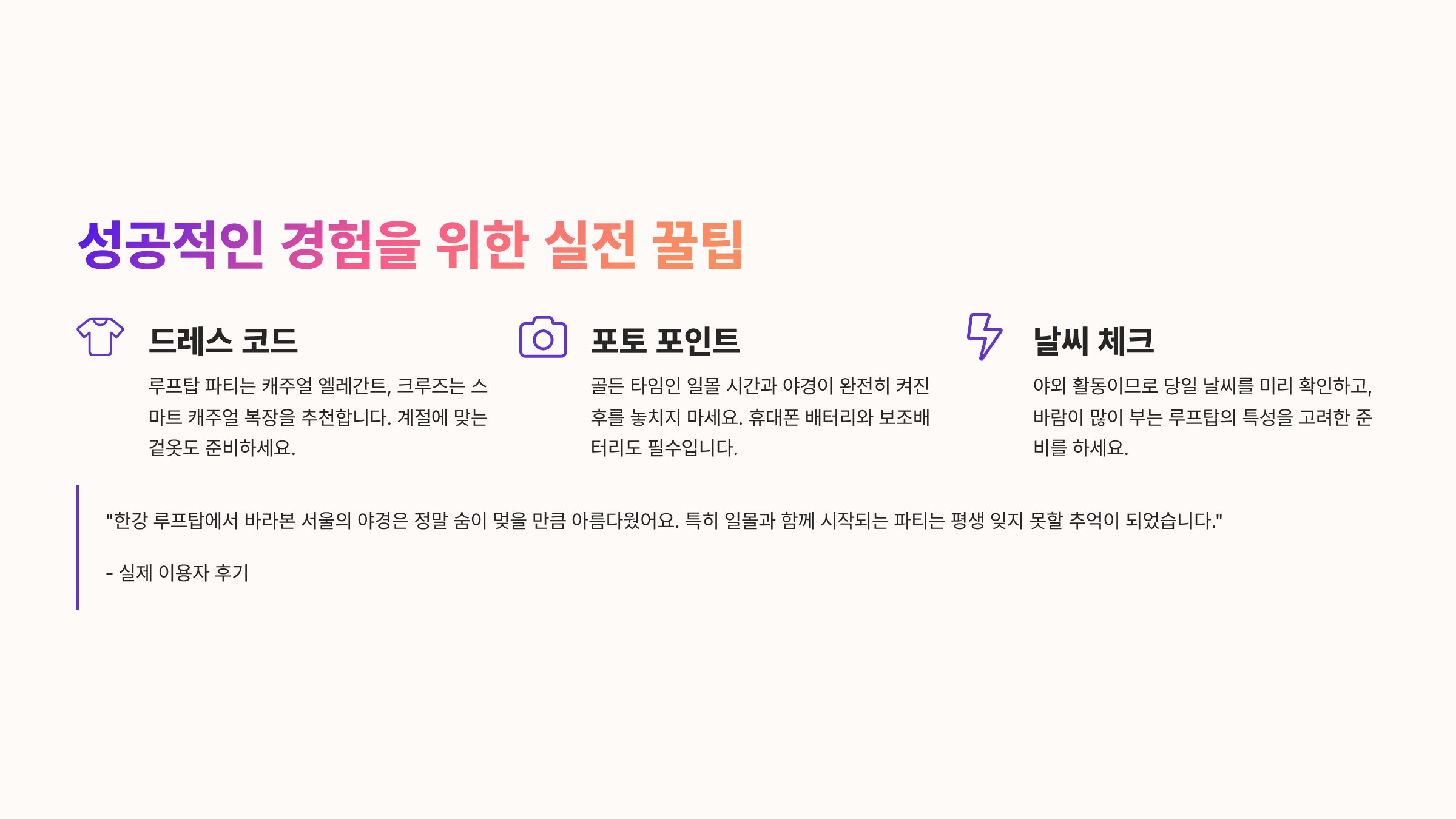 특별한 경험을 더욱 완벽하게 만들고 싶다면 몇 가지 팁을 알아두는 것이 좋습니다. 첫째, 날씨와 미세먼지를 미리 확인하세요. 야외 활동의 비중이 큰 만큼, 맑고 깨끗한 날씨가 아름다운 풍경을 보장합니다. 둘째, 사진 촬영 팁입니다. 한강의 야경을 배경으로 멋진 사진을 찍기 위해서는 삼각대를 준비하거나, 조명이 좋은 시간을 노리는 것이 좋습니다. 특히 해가 질 무렵의 '매직 아워'는 환상적인 색감의 사진을 얻을 수 있는 최고의 시간입니다. 셋째, 교통편을 미리 확인하세요. 주말 밤에는 교통이 혼잡할 수 있으므로, 대중교통을 이용하거나 주차 공간을 충분히 확보하는 것이 중요합니다. 마지막으로, 복장은 너무 격식을 차리기보다 편안하면서도 스타일리시한 '파티룩'을 선택하는 것이 좋습니다. 밤에는 기온이 내려가니 가볍게 걸칠 수 있는 옷도 필수입니다.