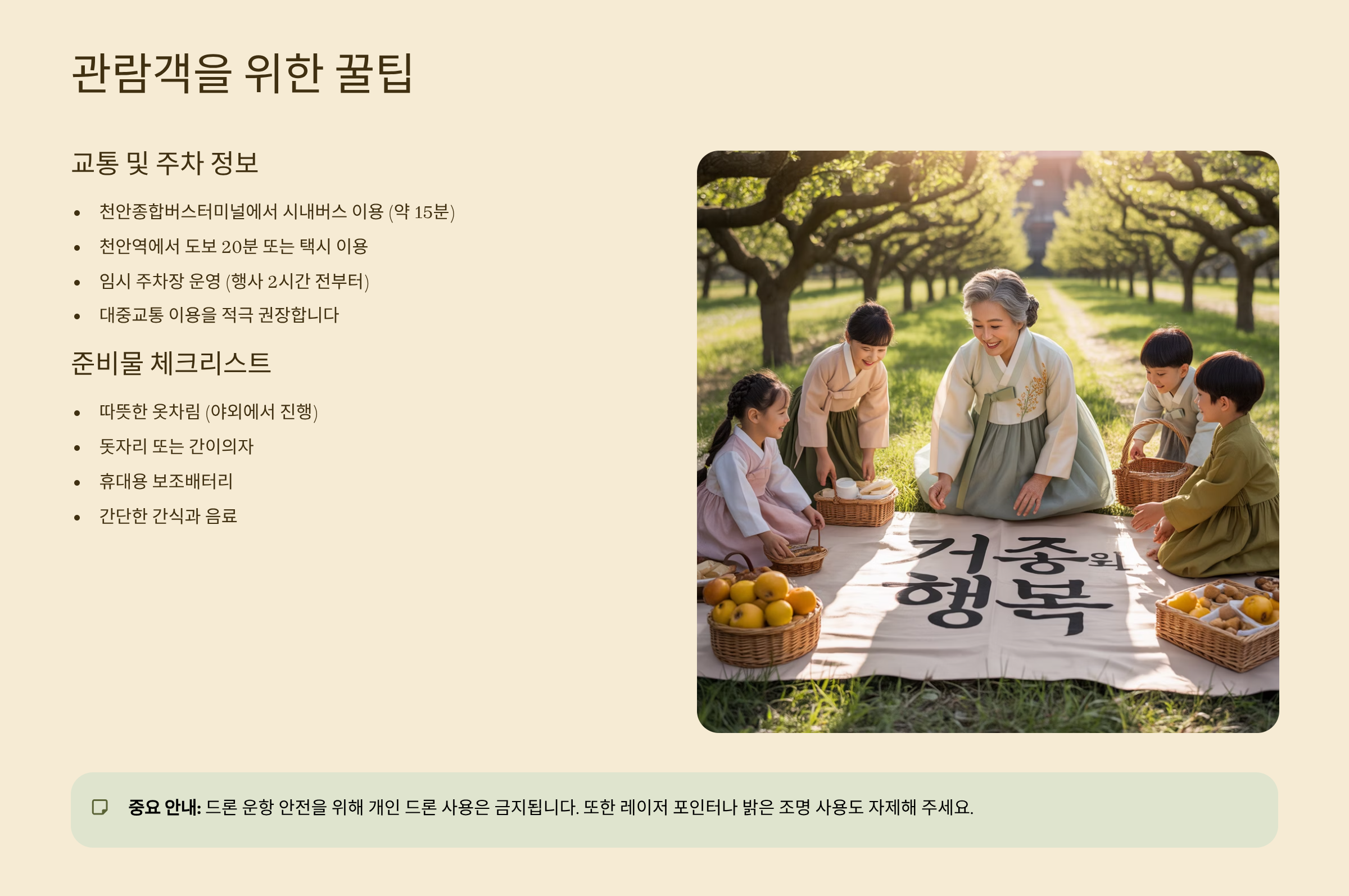 나만의 관람 후기 보러가기관람객을 위한 꿀팁: 교통, 준비물, 주의사항 📝