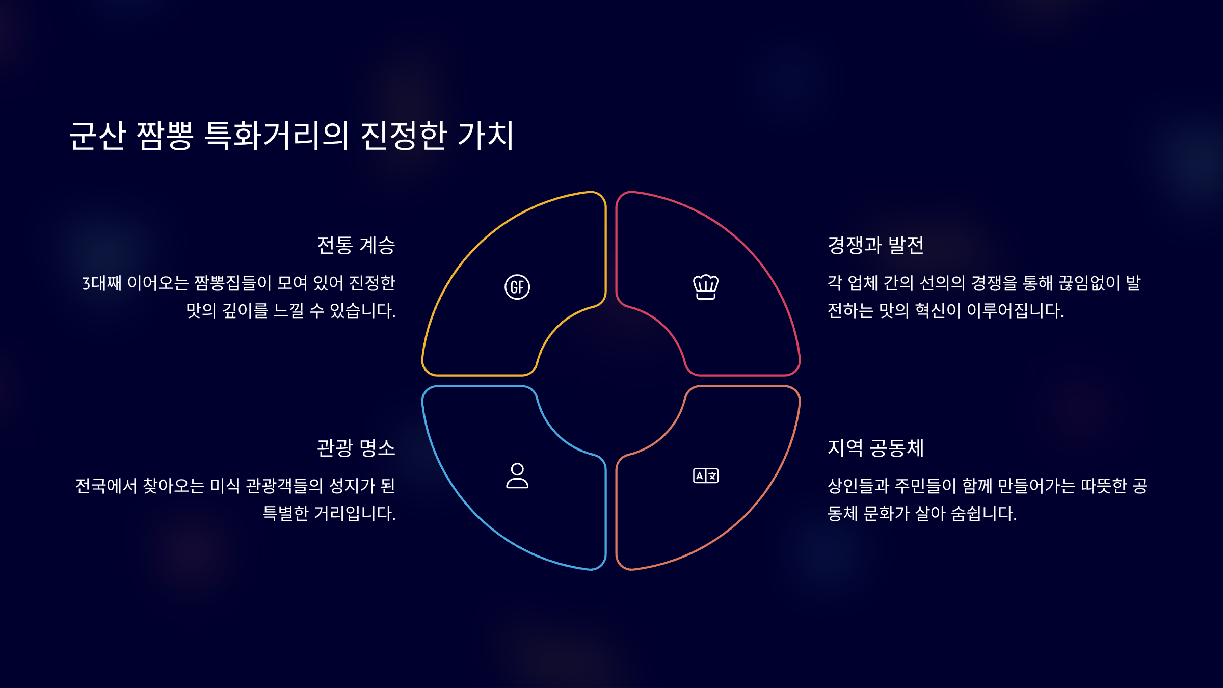 A: 짬뽕을 주제로 한 다양한 먹거리와 체험, 공연을 통해 군산의 짬뽕 역사를 알리고, 관광과 미식을 결합한 축제로 군산의 정체성을 강화합니다.