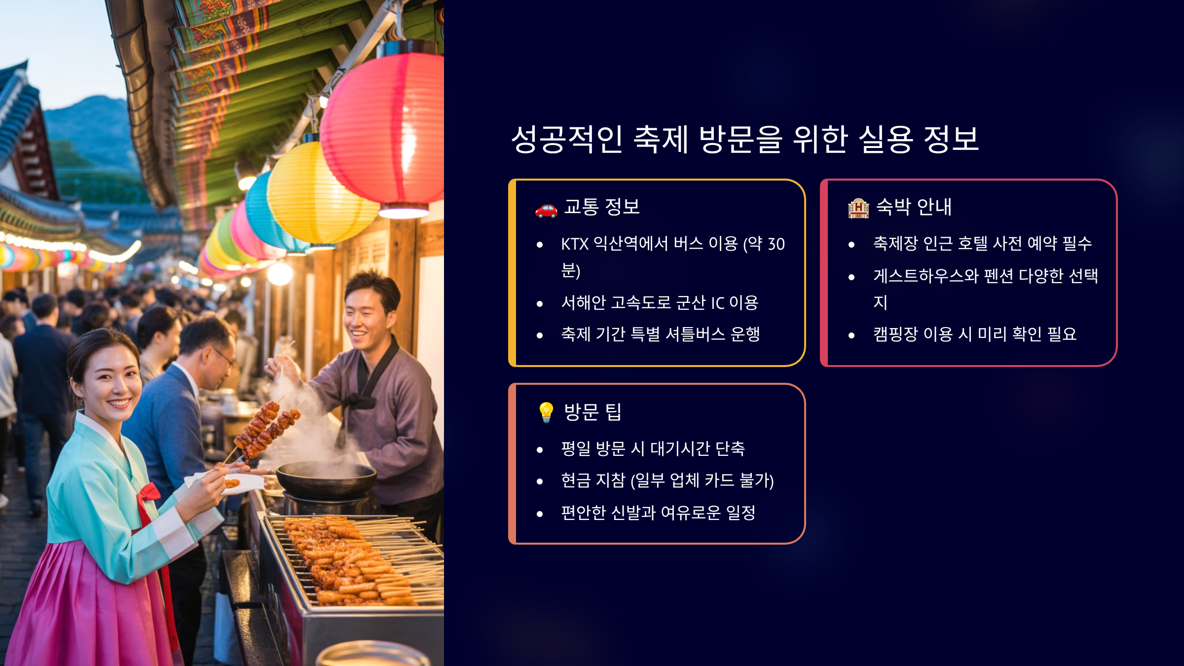 ⚠️ 주의하세요! 축제 기간은 군산 시간여행축제와 동일하므로, 혼잡이 예상됩니다. 여유로운 여행을 위해 숙소와 교통편을 미리 예약하는 것이 좋습니다.