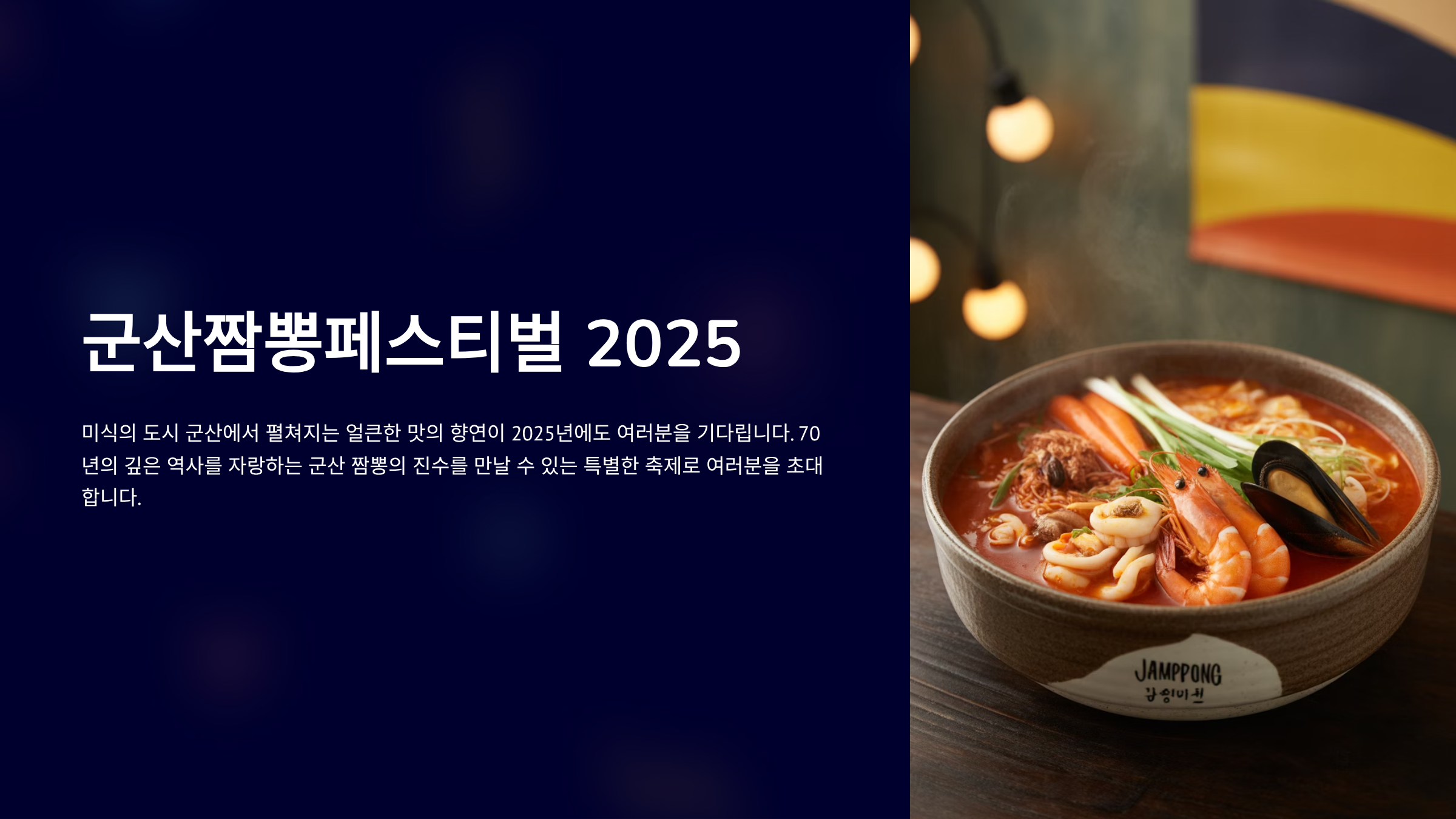 군산짬뽕페스티벌: 70년 역사를 품은 미식 축제, 군산 짬뽕페스티벌의 모든 것! 2025년 가을, 군산의 대표 미식 축제인 '군산짬뽕페스티벌'이 돌아옵니다. 더욱 업그레이드된 프로그램과 차별화된 경험으로 가득한 축제 정보를 미리 확인하고, 짬뽕의 진수를 맛보세요.