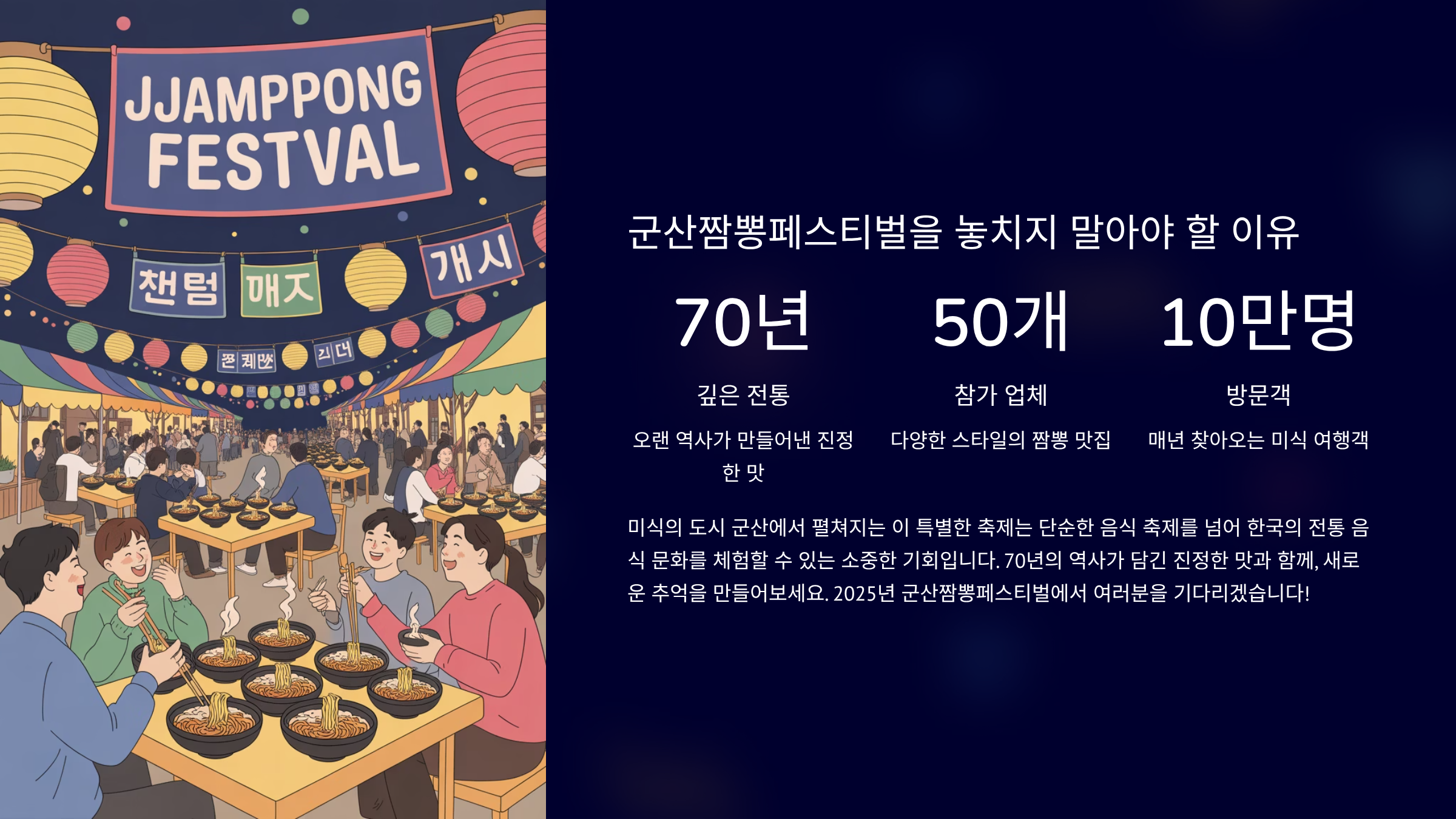 2025년 군산짬뽕페스티벌은 단순히 맛있는 짬뽕을 먹는 것을 넘어, 군산의 역사와 문화를 체험하고 특별한 추억을 만들 수 있는 소중한 기회입니다. '0.5인분'이라는 새로운 제도로 더 많은 짬뽕을 맛볼 수 있고, 총감독제 도입으로 더욱 짜임새 있는 축제 콘텐츠를 즐길 수 있습니다. 10월 9일부터 12일까지, 군산 백년광장으로 오셔서 얼큰한 짬뽕 한 그릇과 함께 가을의 낭만을 만끽해 보세요. 가족, 연인, 친구와 함께 방문하여 잊지 못할 추억을 만들어보시는 것을 적극 추천합니다.