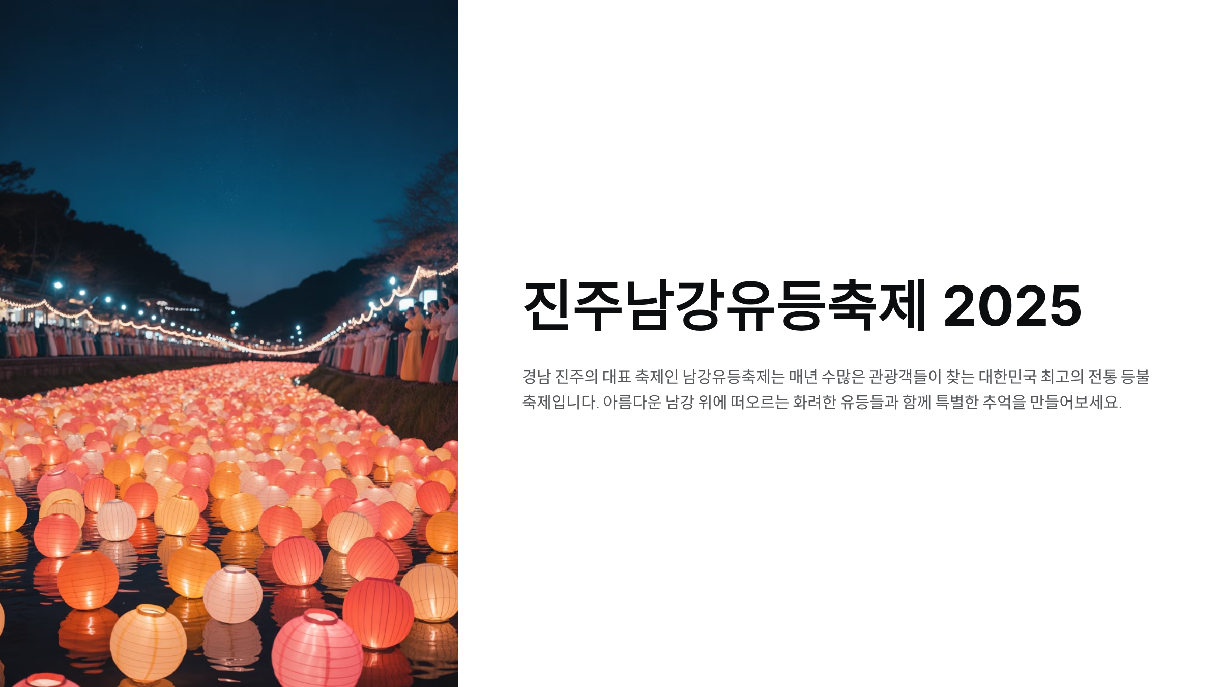 매년 가을, 경남 진주의 밤을 수놓는 **진주남강유등축제**는 단순한 볼거리를 넘어 임진왜란 진주대첩의 역사적 의미와 순국선열의 숭고한 넋이 깃든 대한민국 대표 글로벌 축제입니다. 2025년에는 '역사의 강, 평화를 담다: POWER OF KOREA'를 주제로 약 7만여 개의 유등이 남강과 진주성을 화려하게 밝힐 예정입니다. 특히 올해는 드론 라이트 쇼, 3D 홀로그램 등 첨단 기술이 접목된 환상적인 야경 콘텐츠가 강화되어 역대급 경험을 예고하고 있습니다. 지금부터 축제의 유래부터 2025년 최신 일정, 필수 관람 포인트, 그리고 축제를 100% 즐기는 비법까지 자세히 안내해 드리겠습니다.