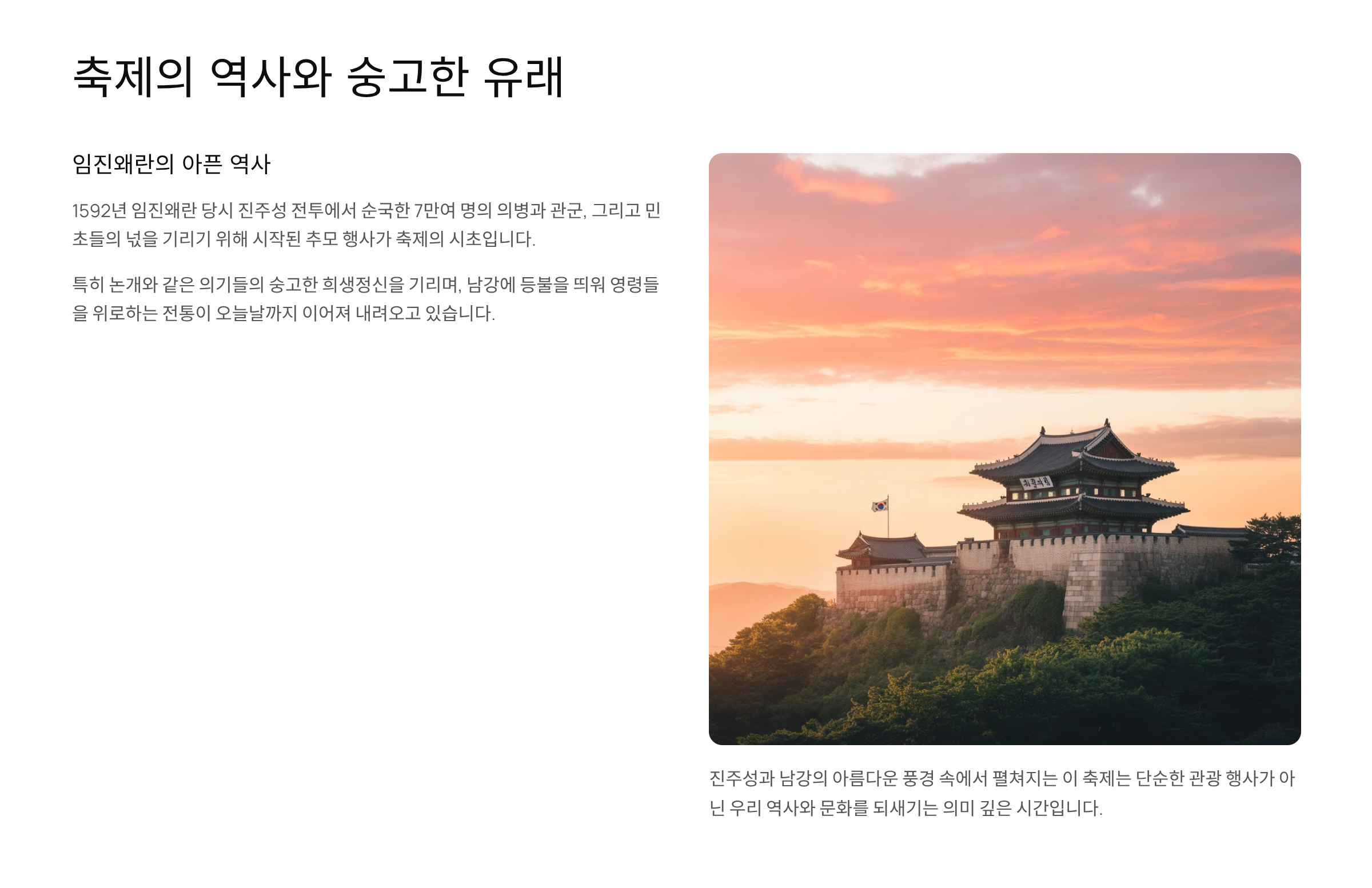 지금까지 2025년 진주남강유등축제의 모든 것을 자세히 알아보았습니다. 임진왜란의 역사를 간직한 숭고한 빛과 현대 기술이 결합된 환상적인 야경은 진주에서만 경험할 수 있는 특별한 감동을 선사할 것입니다. 이 가이드를 참고하여 철저히 계획을 세우시고, 사랑하는 사람들과 함께 가을밤을 빛으로 물들이는 **진주남강유등축제 2025**에서 잊지 못할 추억을 만드시기를 바랍니다. 더 궁금한 점이나 최신 업데이트 정보가 있다면 댓글로 편하게 물어봐주세요! 😊