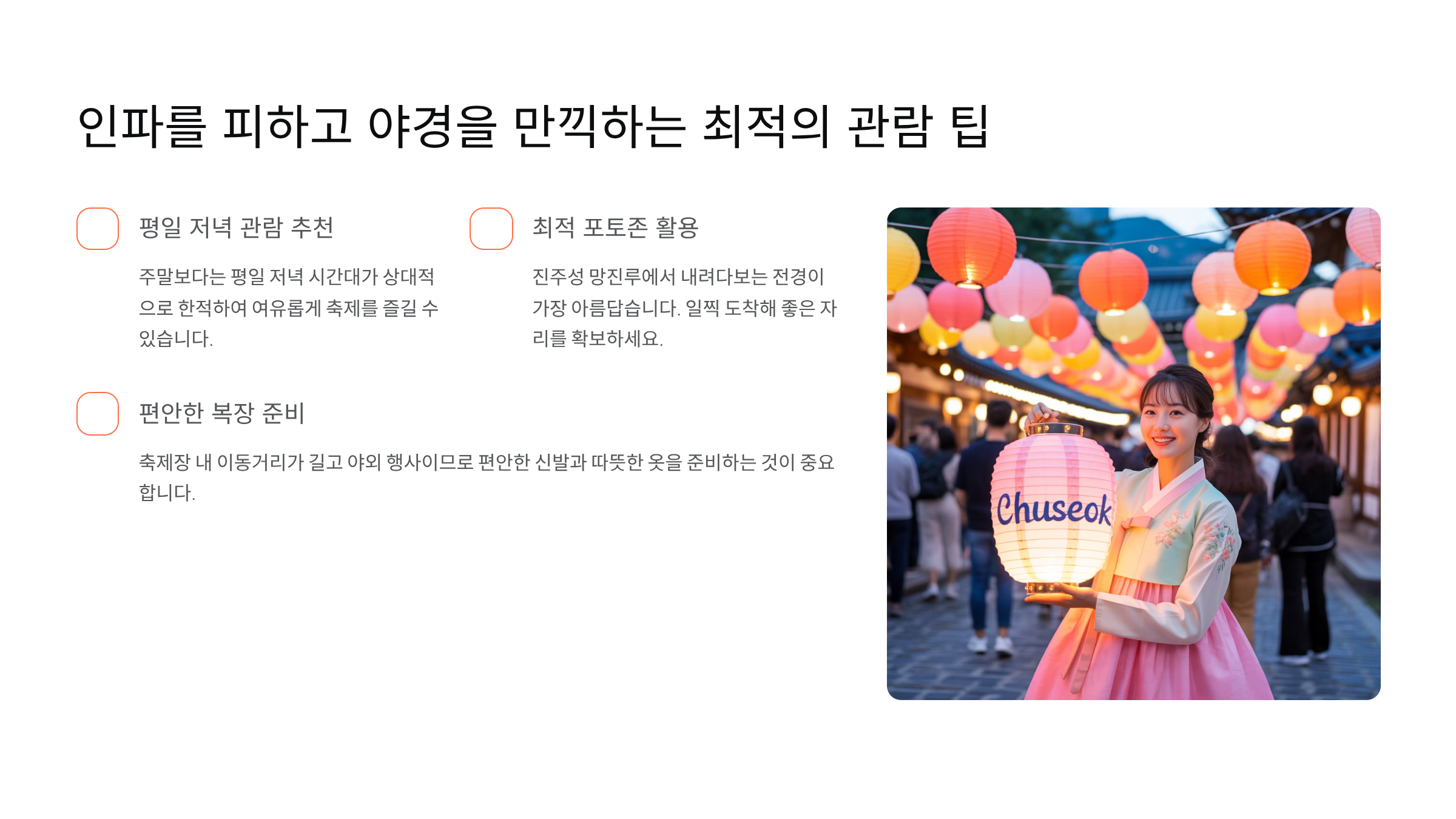 진주남강유등축제는 매년 수백만 명이 찾는 대규모 축제인 만큼, 효과적인 관람 전략이 필요합니다. 특히 주말 저녁 시간대(19:00~22:00)는 인파가 절정에 달하므로, 다음의 팁들을 활용하여 혼잡을 피하고 축제를 쾌적하게 즐겨보세요.