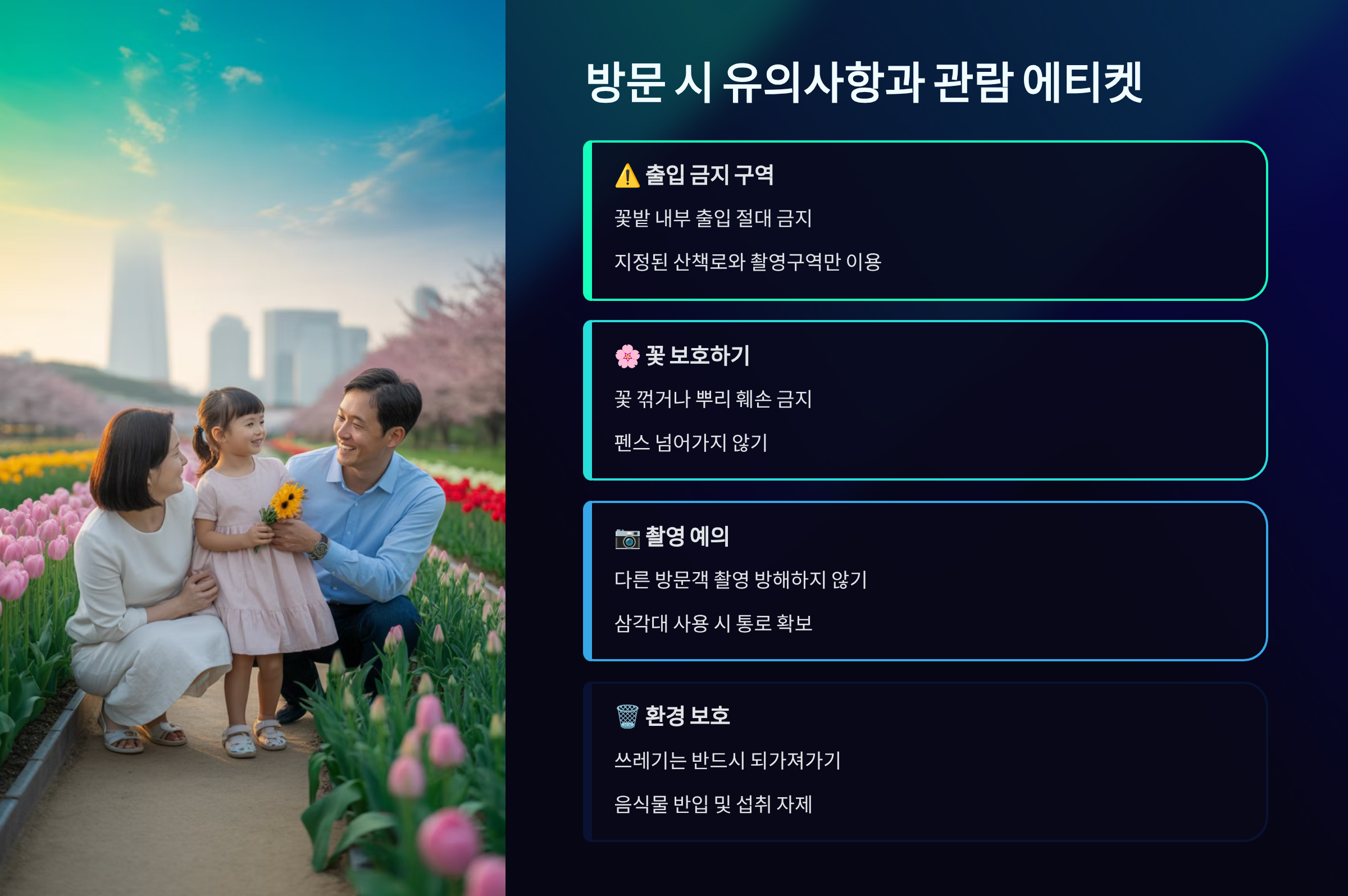 인파를 피하고 싶다면 오전 9시 이전 이른 아침 시간을 공략하는 것이 가장 좋습니다. 이때는 공기도 맑고 고요하여 한적하게 꽃밭을 거닐 수 있습니다. 반면, 주말 오후 시간대(14:00~16:00)는 가장 많은 인파가 몰리는 시간으로, 대기 시간이 길어지거나 원하는 포토존에서 사진을 찍기 어려울 수 있으니 피하는 것을 추천합니다. 평일 점심시간 직후(13:00~15:00)는 비교적 한산하면서도 햇빛이 좋아 가벼운 산책에 적합합니다.