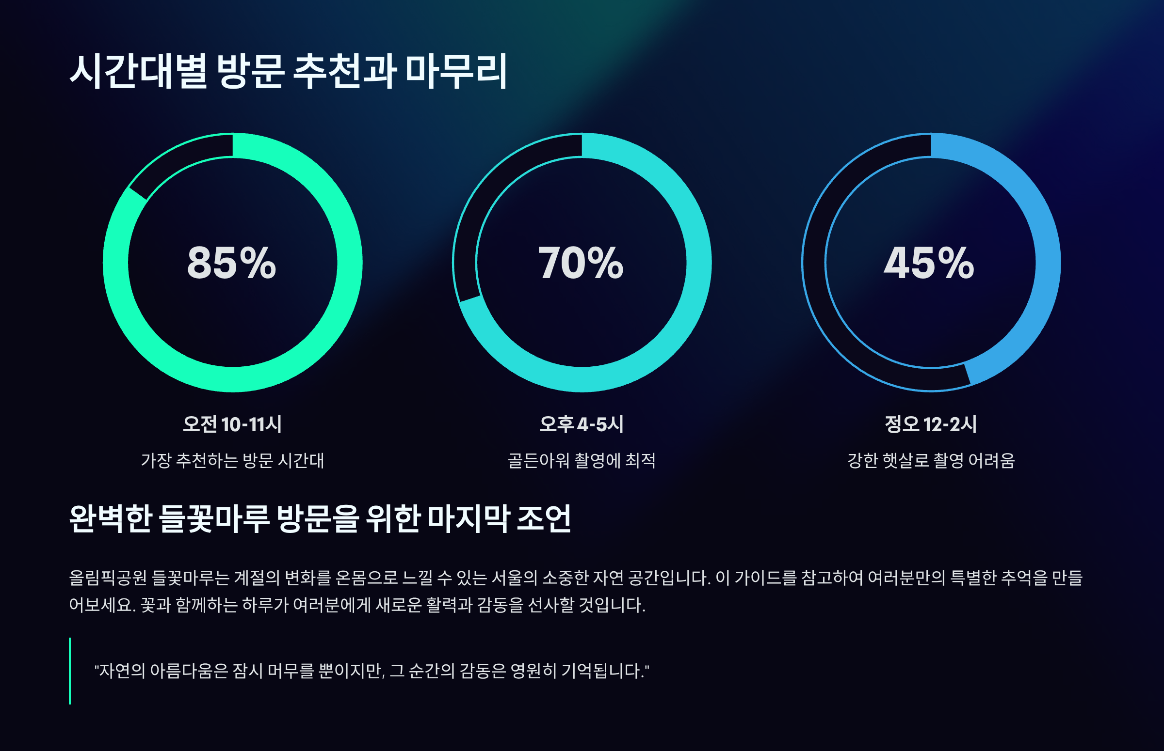 서울 올림픽공원 들꽃마루는 계절의 변화를 가장 아름답게 담아내는 서울 도심 속 보석 같은 공간입니다. 봄의 양귀비부터 가을의 황화코스모스까지, 이 전문 가이드에서 제공한 최신 정보와 팁을 활용하여 여러분의 들꽃마루 방문을 최고의 추억으로 만드시길 바랍니다. 특히 인생샷을 위한 시간대와 주차 꿀팁은 꼭 기억해두세요! 더 궁금한 점이 있다면 언제든지 댓글로 물어봐주세요~ 😊