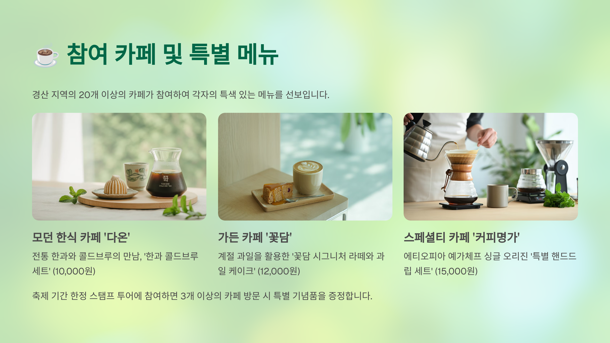 축제 기간 동안 경산의 대표 카페들이 참여해 특별한 커피와 디저트를 선보여요.