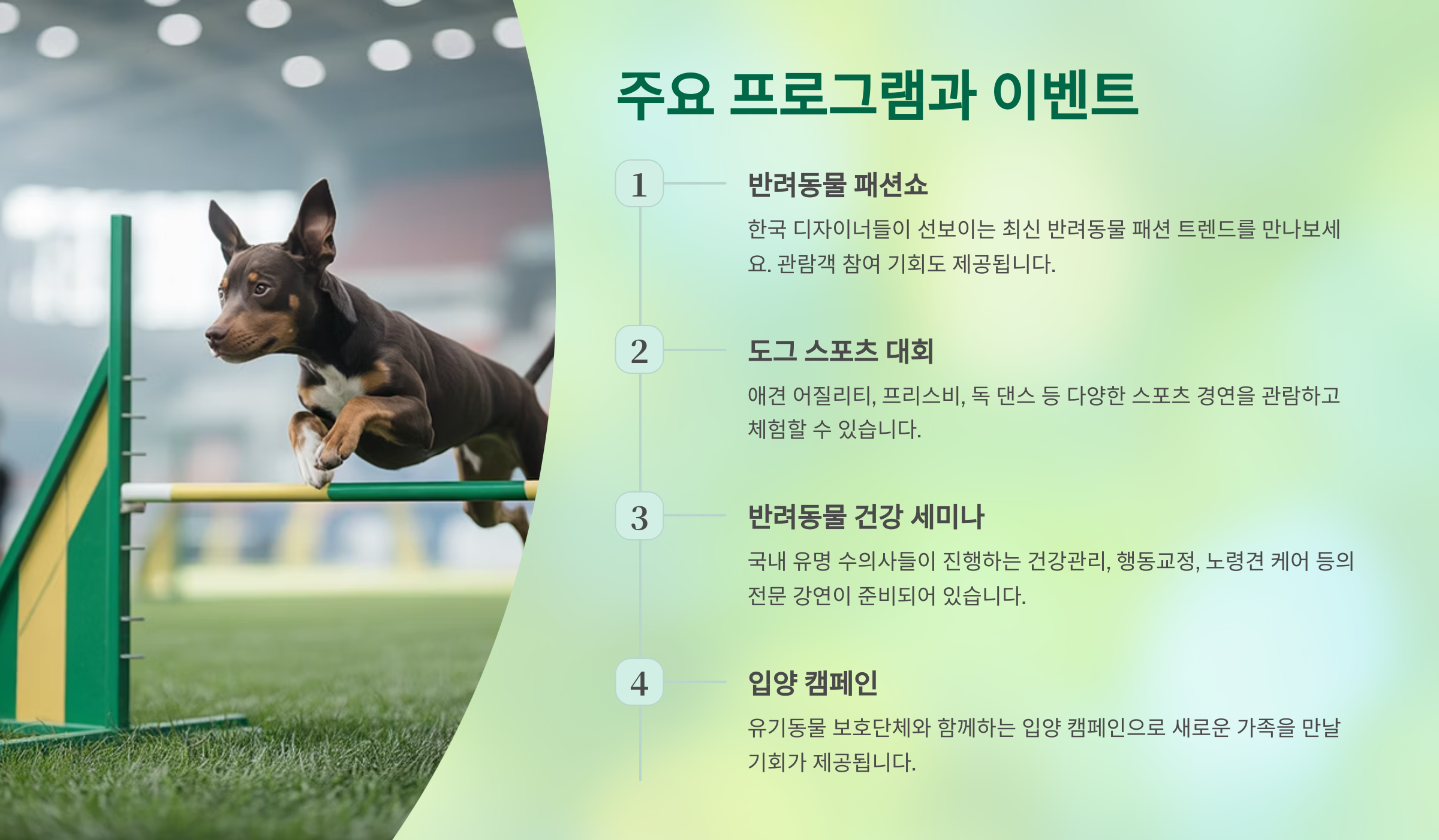 행사 기간 중에는 특별 할인과 경품 이벤트, 반려견·반려묘 콘테스트, 전문가 강연 등 풍성한 프로그램이 진행돼 방문의 즐거움을 더해요.