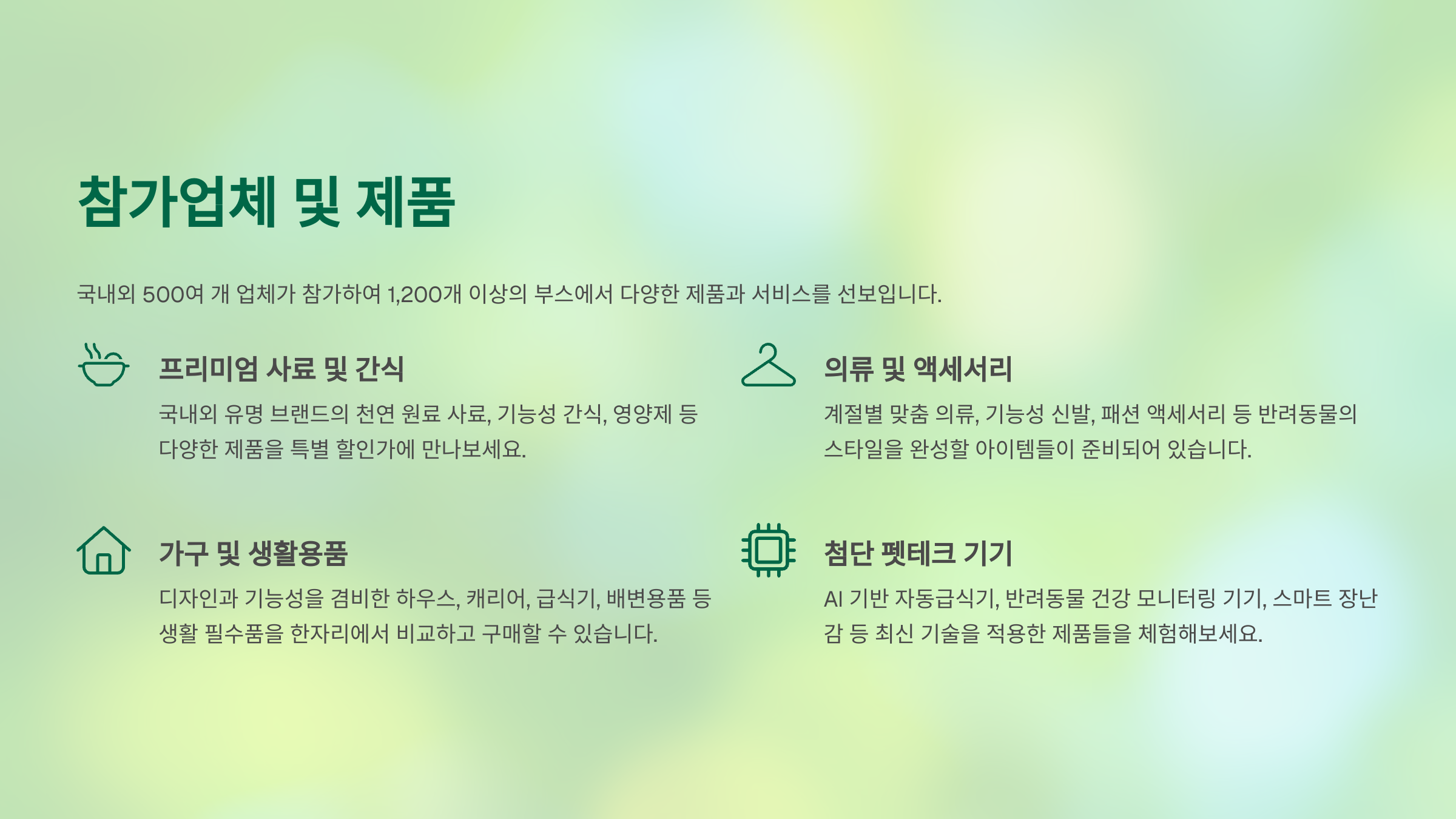 다양한 카테고리의 전시 품목을 통해 반려동물 산업의 최신 트렌드를 확인하세요. 관심 있는 분야를 클릭하여 자세한 내용을 살펴볼 수 있습니다.