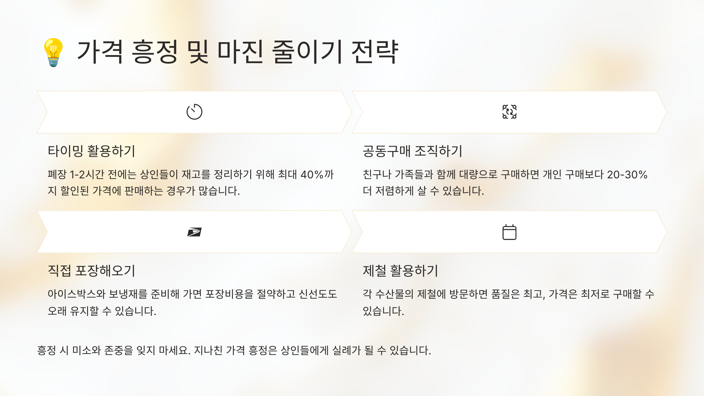 여수 수산물 장터에서 가장 중요한 포인트는 바로 가격 흥정이에요. 상인과의 대화를 통해 중간 마진 없이 합리적인 가격에 신선한 해산물을 구매하는 것이 여행의 즐거움을 배가시키는 요소랍니다. 흥정은 예의 바르고 유쾌하게 진행하는 것이 중요해요.