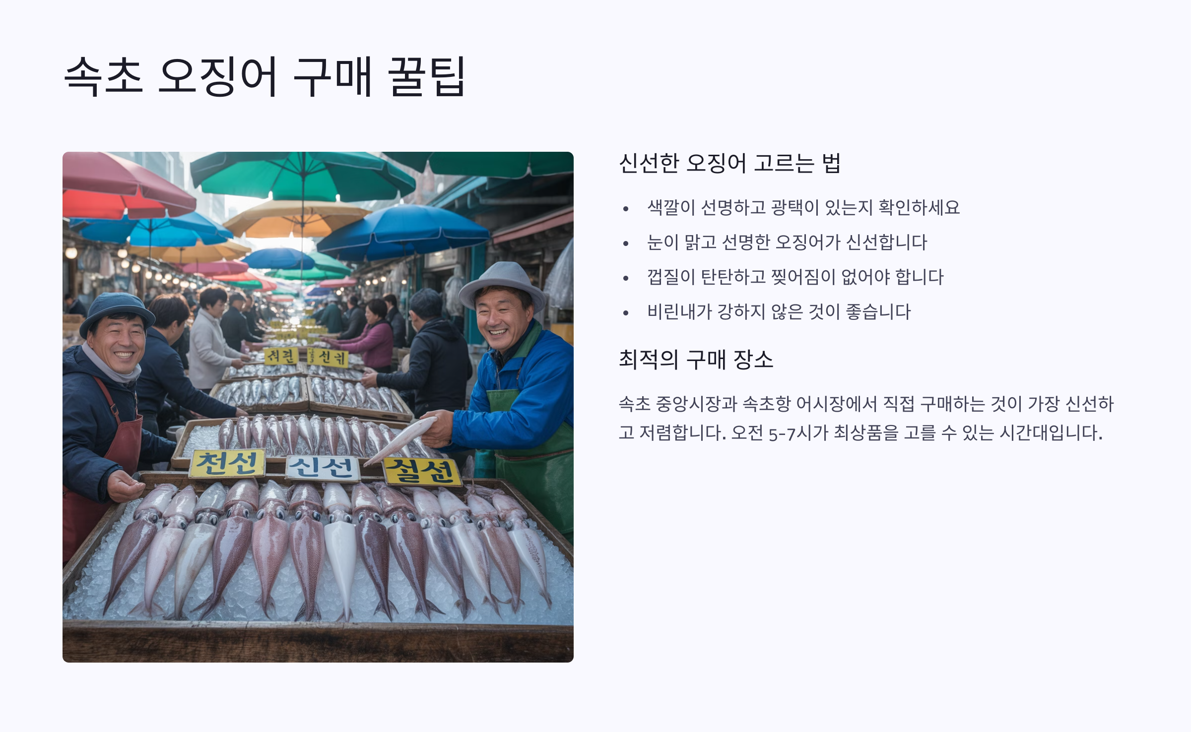 속초에서는 오징어를 다채로운 요리로 즐길 수 있습니다. 각 요리의 매력을 알아보고 취향에 맞는 메뉴를 선택해보세요. 카드를 클릭하면 상세 정보를 볼 수 있습니다.