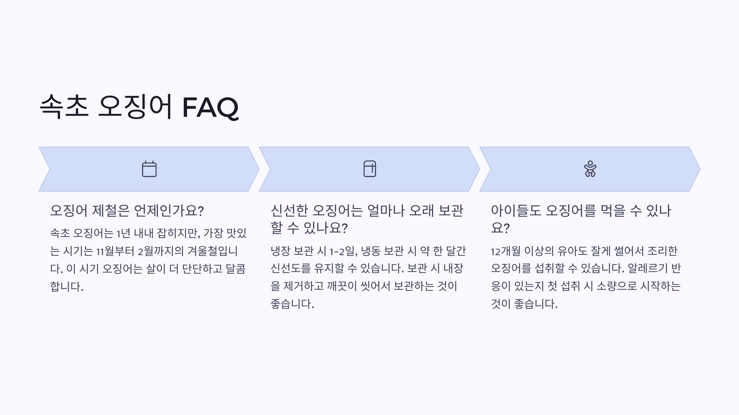 구매 전에는 오징어 몸체가 탄력 있고, 눈이 맑은지 확인하세요. 이 조건이 신선도의 기본이에요. 냄새도 깨끗한 바다향이 나는지 꼭 맡아보면 좋아요.
