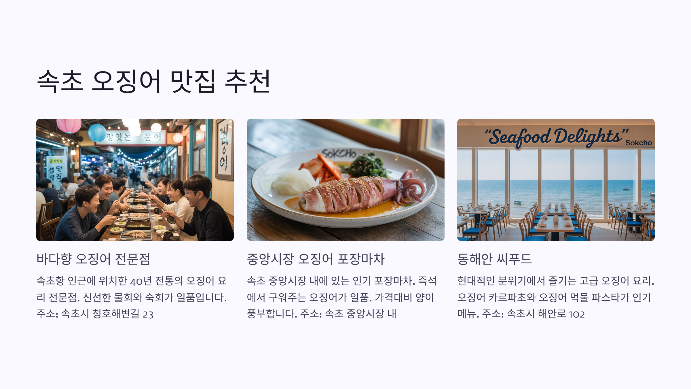 이 맛집들은 모두 속초 현지인들이 강력 추천하는 곳들이에요. 각각의 매력적인 메뉴를 즐기면서 속초 오징어의 진가를 느껴보세요.