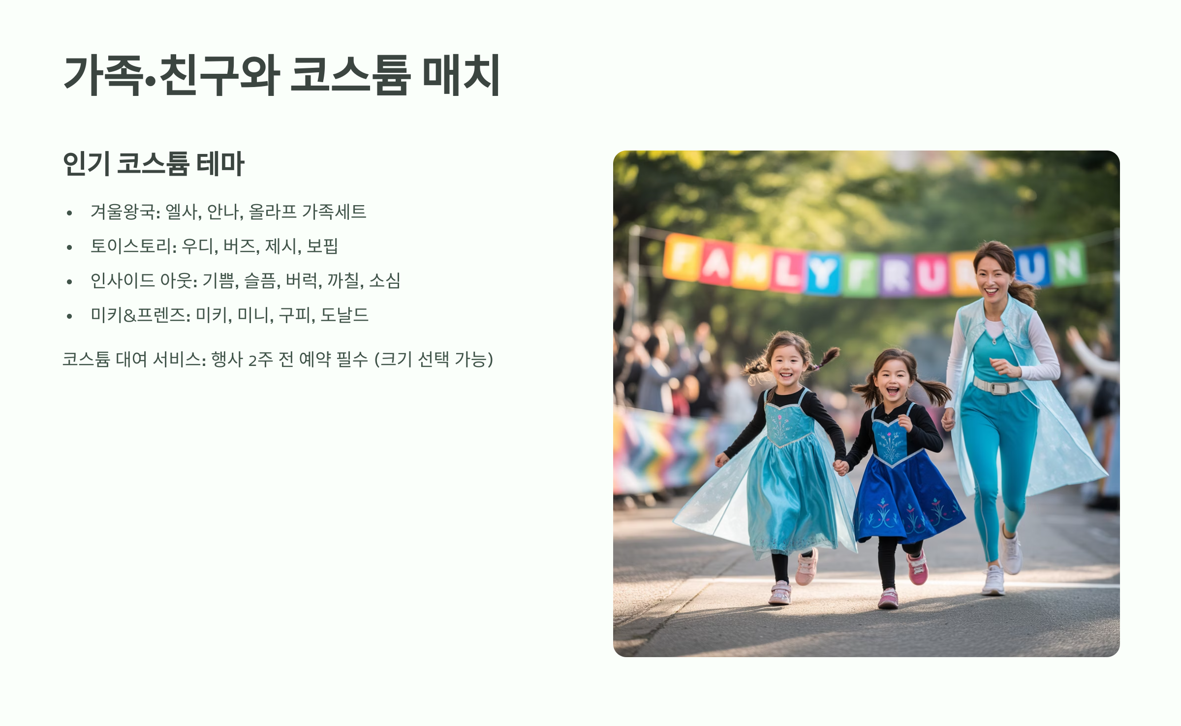 디즈니런의 백미는 가족, 친구와 맞춤형 디즈니 코스튬을 입고 달리는 재미예요. 미키, 겨울왕국, 토이 스토리 등 다양한 캐릭터 의상이 인기랍니다.