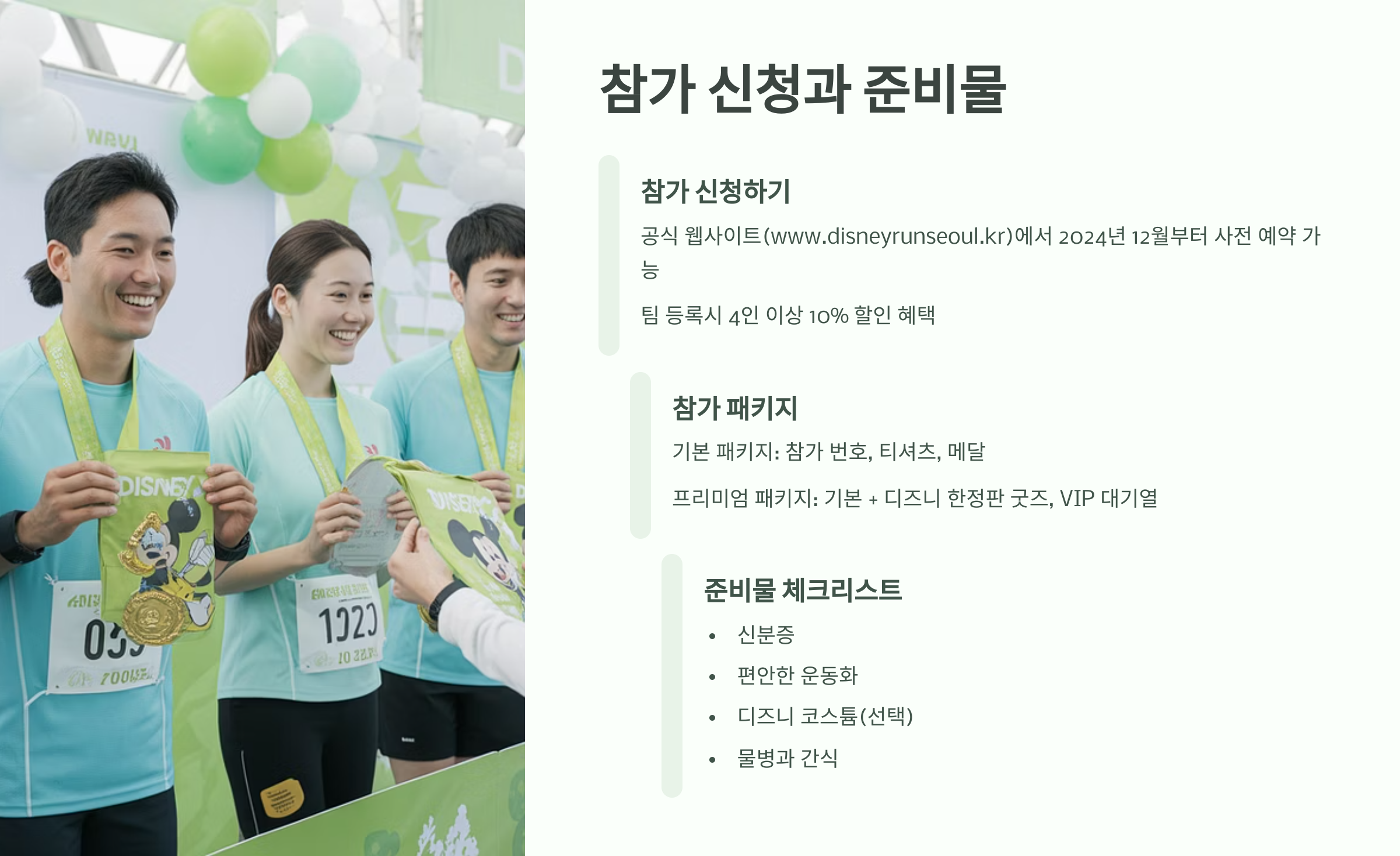 참가비에는 티셔츠, 메달, 디즈니 굿즈가 포함되며, 가족 단위 참여 시 패밀리 패키지를 이용하면 더욱 알찬 혜택을 받을 수 있어요.