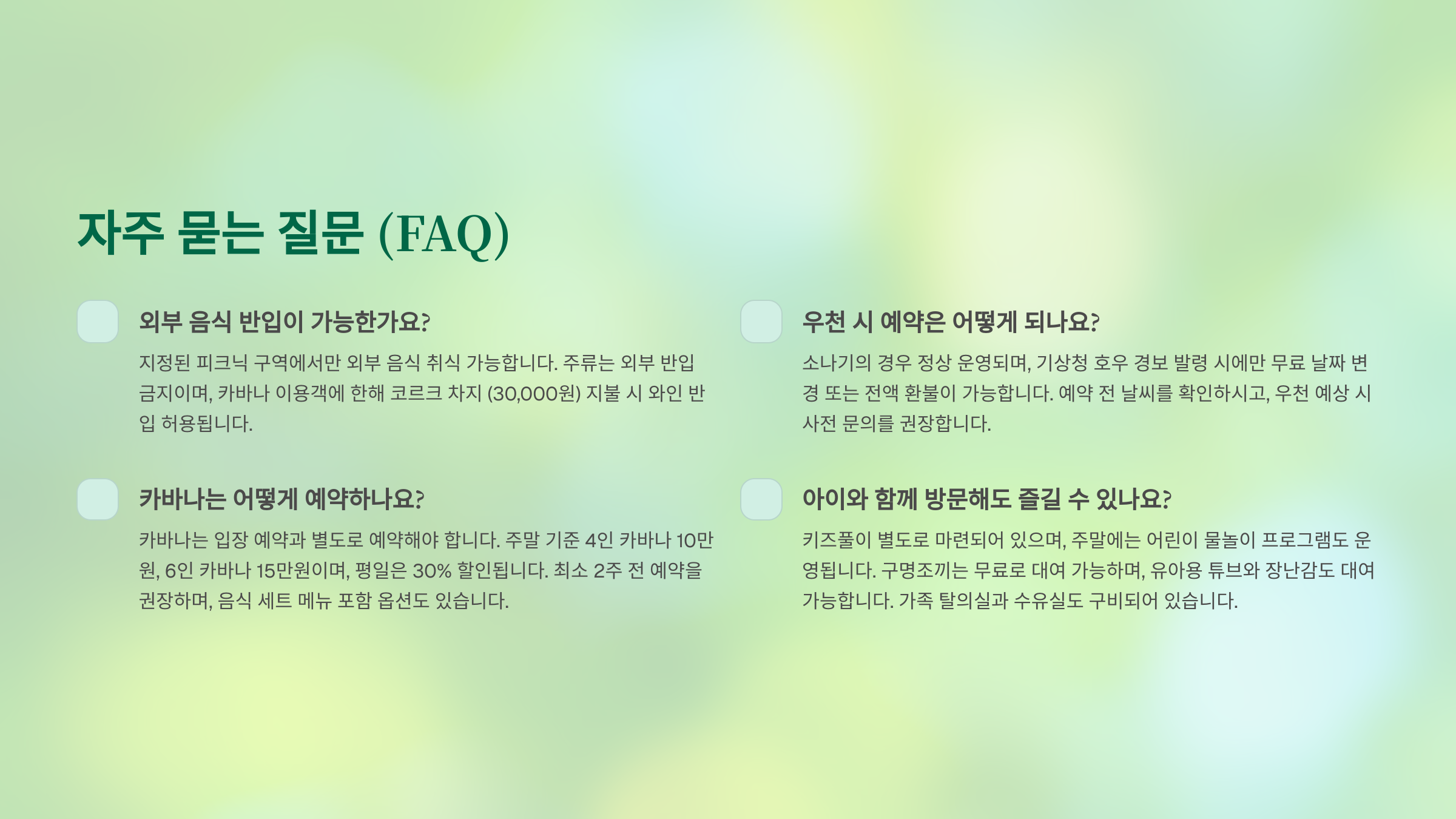 A8. 비 올 경우 실내 공간 이용을 권장하며 예약 시 변경 문의 가능해요.