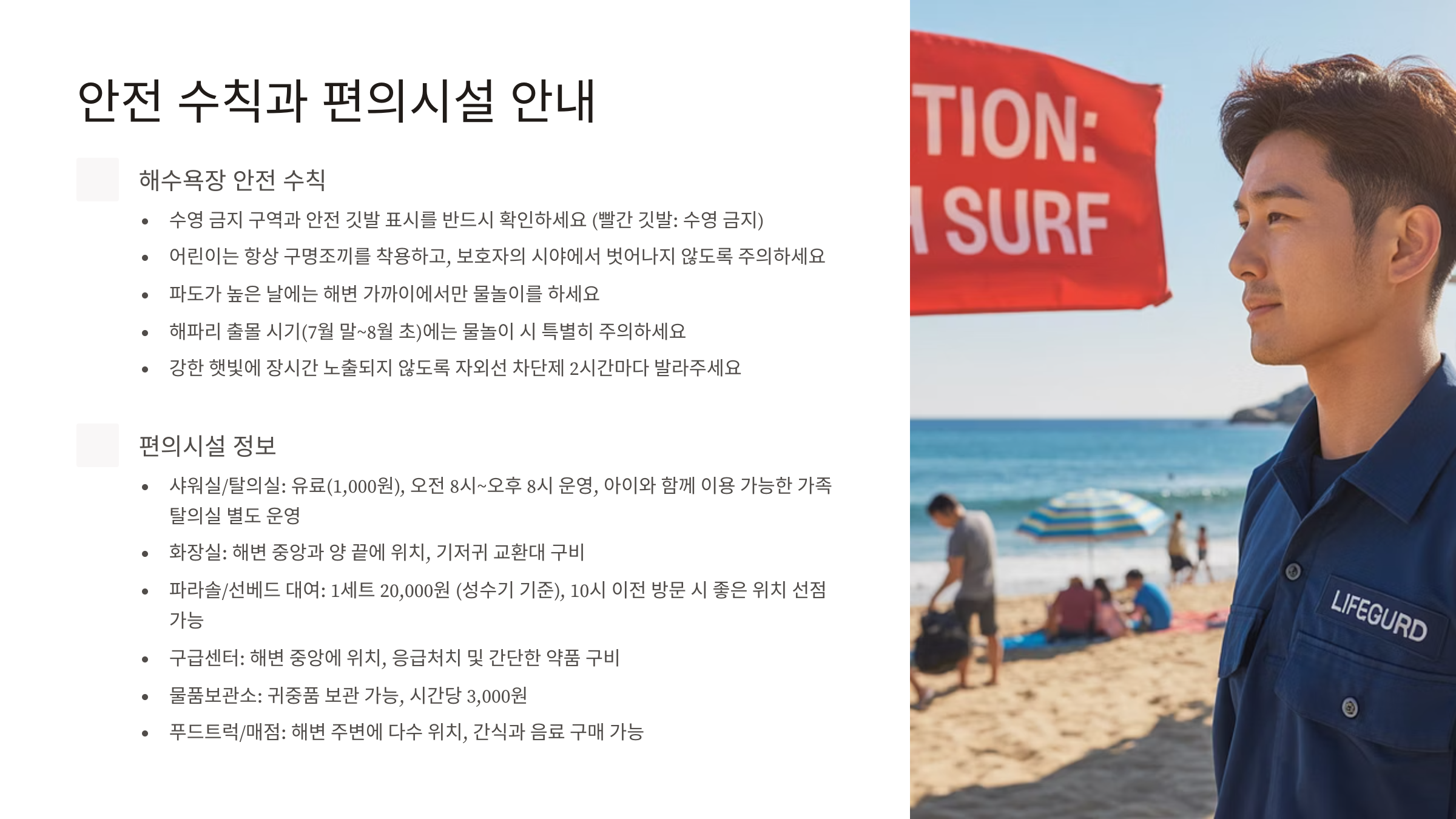 아이들과 함께하는 여행에서는 안전이 최우선이에요. 해수욕장 내 안전 수칙을 잘 지키고 편의시설을 적극 활용하면 더욱 편안하고 즐거운 시간을 보낼 수 있답니다.
