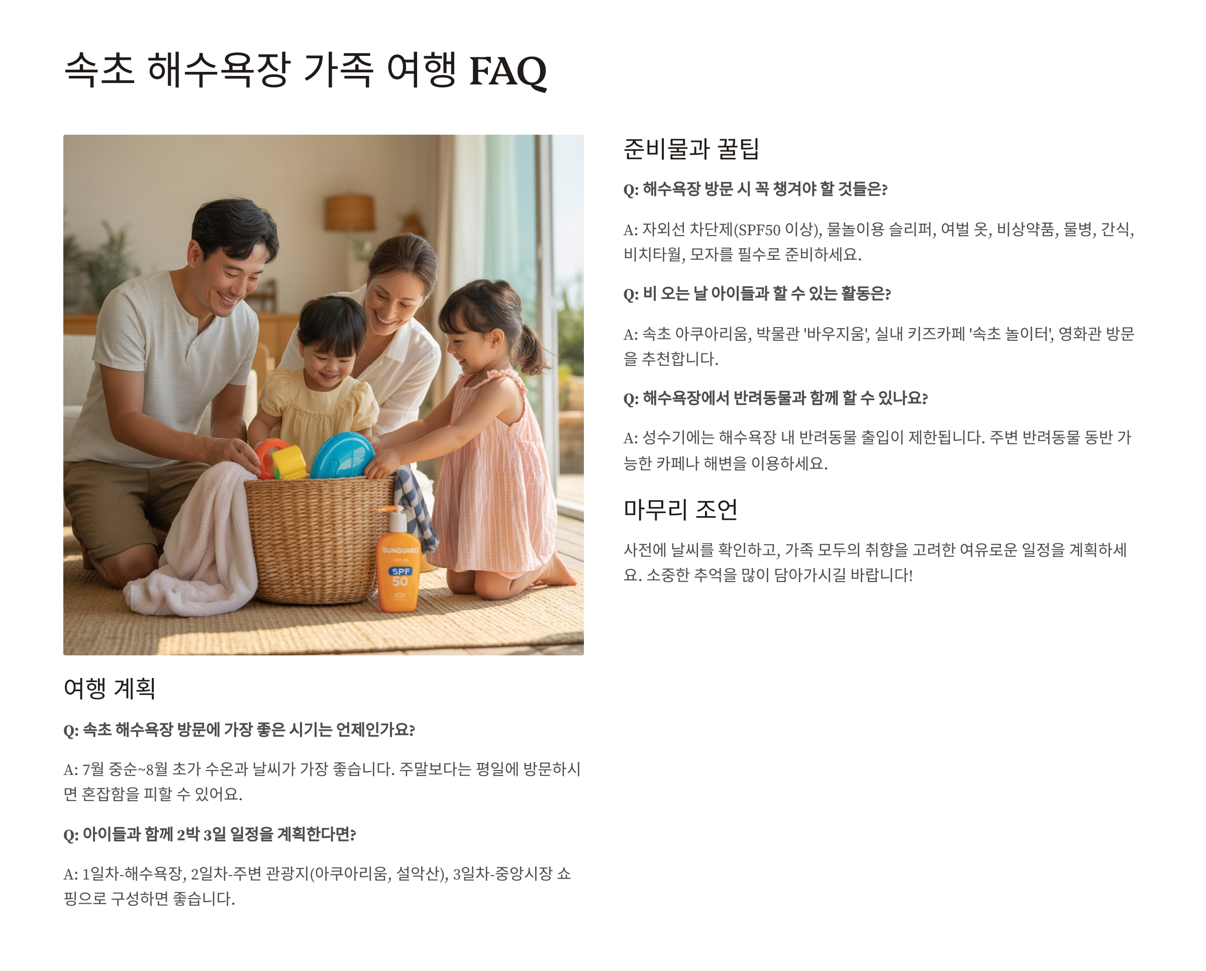 위 FAQ가 속초 해수욕장 가족 여행을 준비하는 데 많은 도움이 되길 바라요! 추가 질문이 있으면 언제든 물어봐 주세요 😊