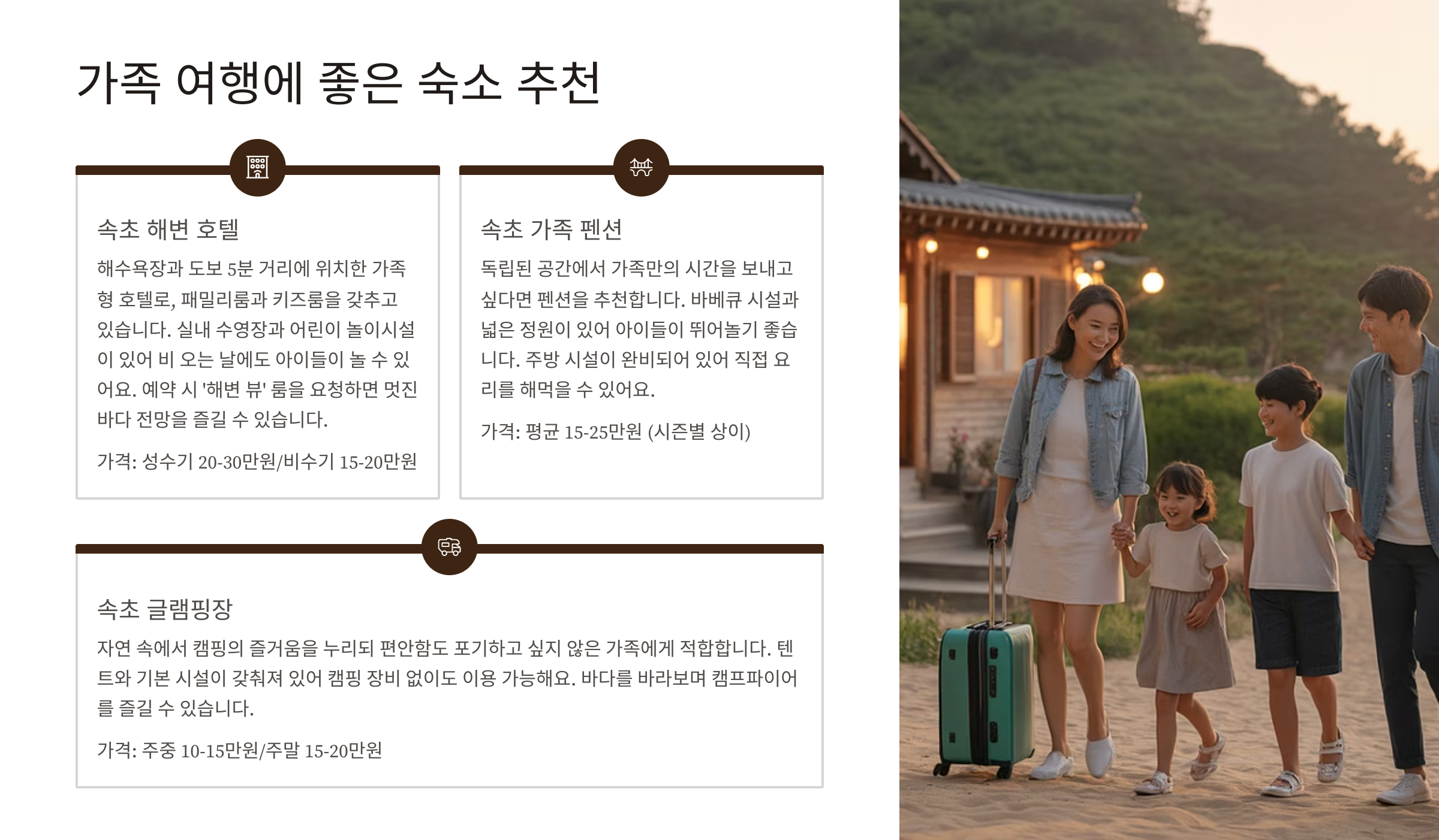 | 가족 호텔 | 속초 시내 | 접근성 우수 | 어린이 놀이시설, 조식 제공 | 중~고가 |