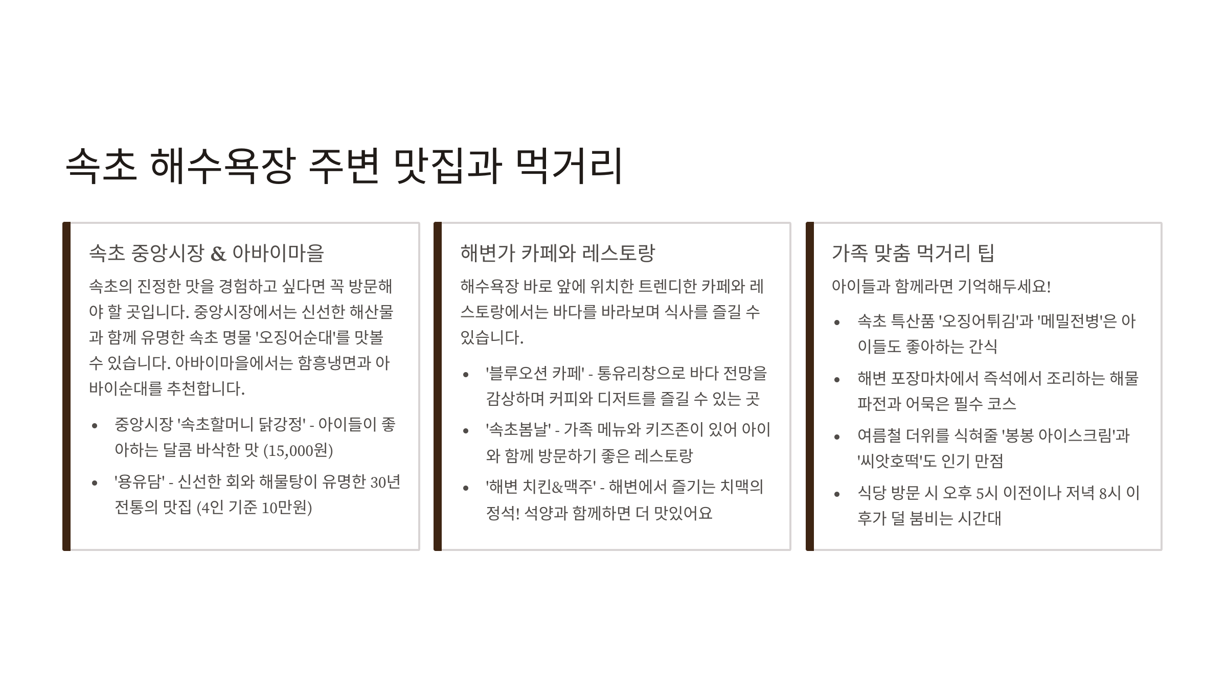 다음은 맛집과 먹거리 정보를 알려줄 차례예요! 속초 맛집에서 가족과 함께 맛있는 시간 보내자고요! 🍽️